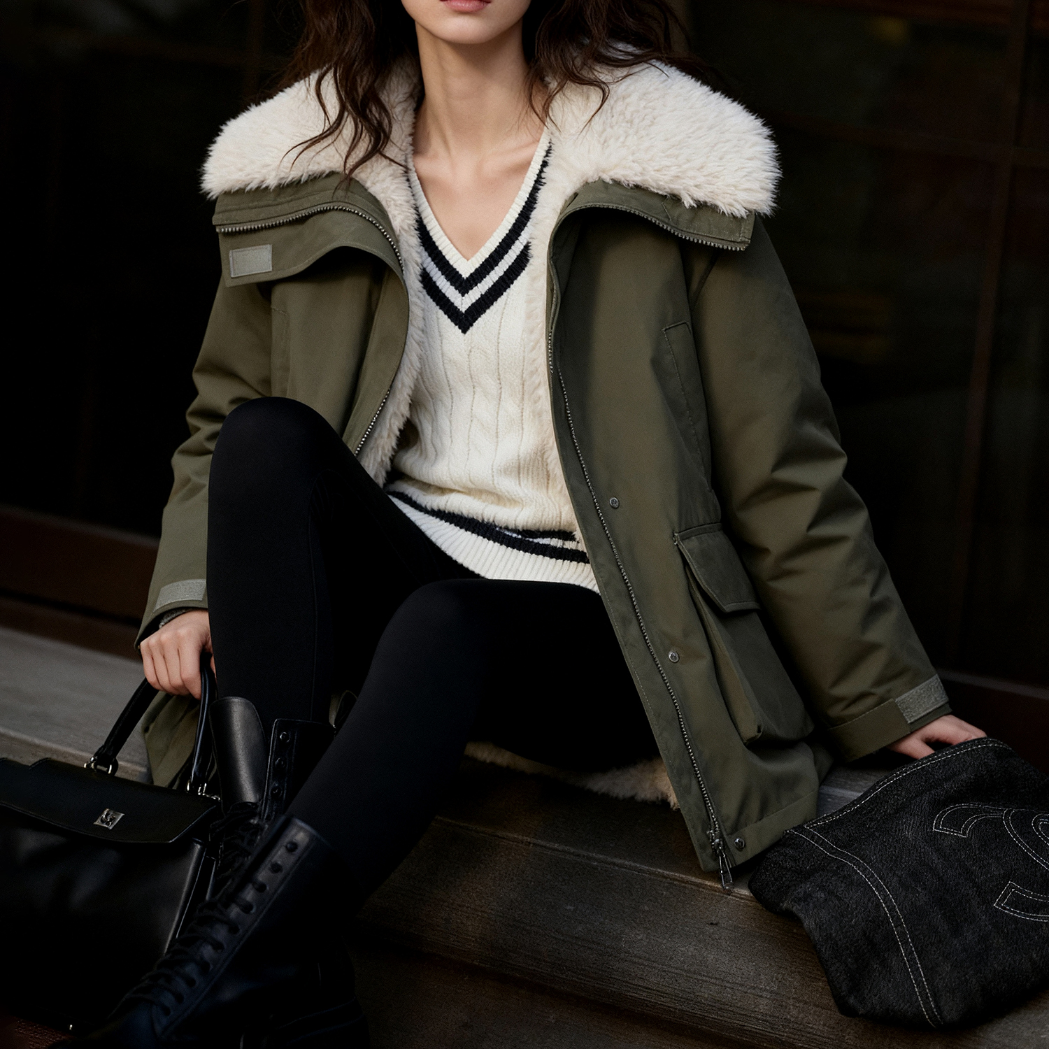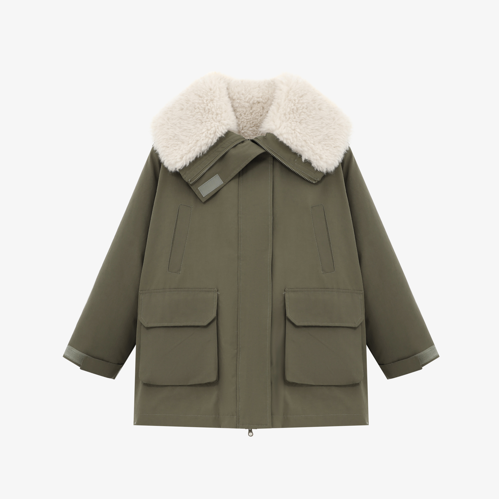 Basic House/百家好毛毛翻领简约棉服冬季保暖中长款棉衣外套女