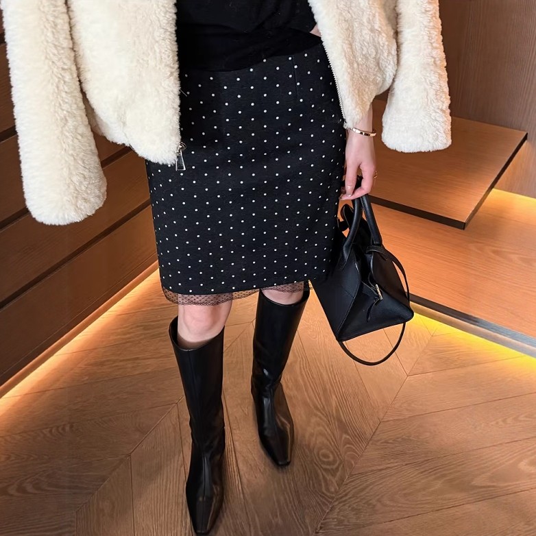 法式波点半身裙女2026春季新款欧货黑色蕾丝拼接高腰显瘦中长裙潮