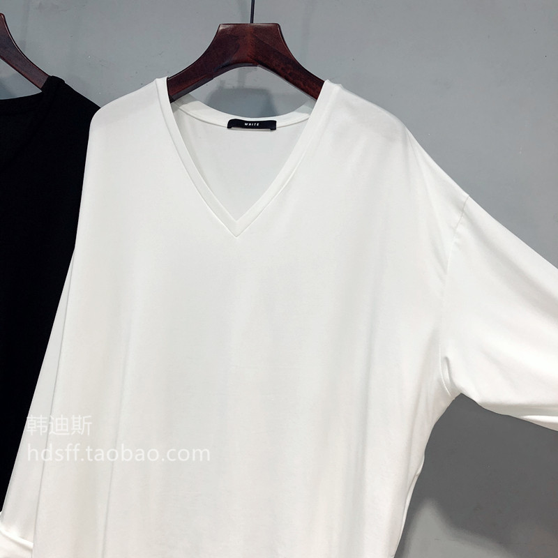 22春装新款纯色V领显瘦单侧开叉宽松垂坠感中长款长袖T恤打底衫女
