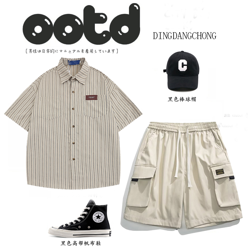 cityboy工装短袖衬衫男夏季宽松休闲五分袖条纹衬衣外套短裤套装