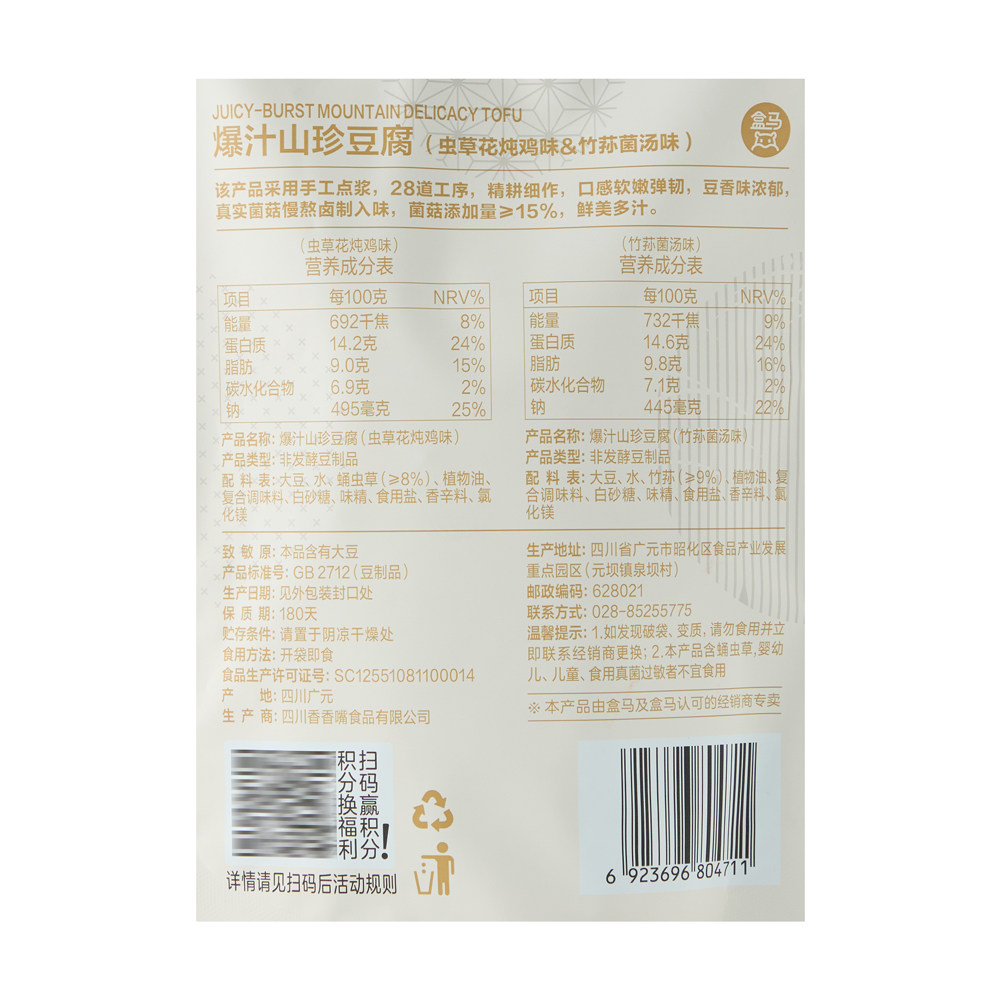 盒马 爆汁山珍豆腐 虫草花炖鸡味&竹荪菌汤味 500g