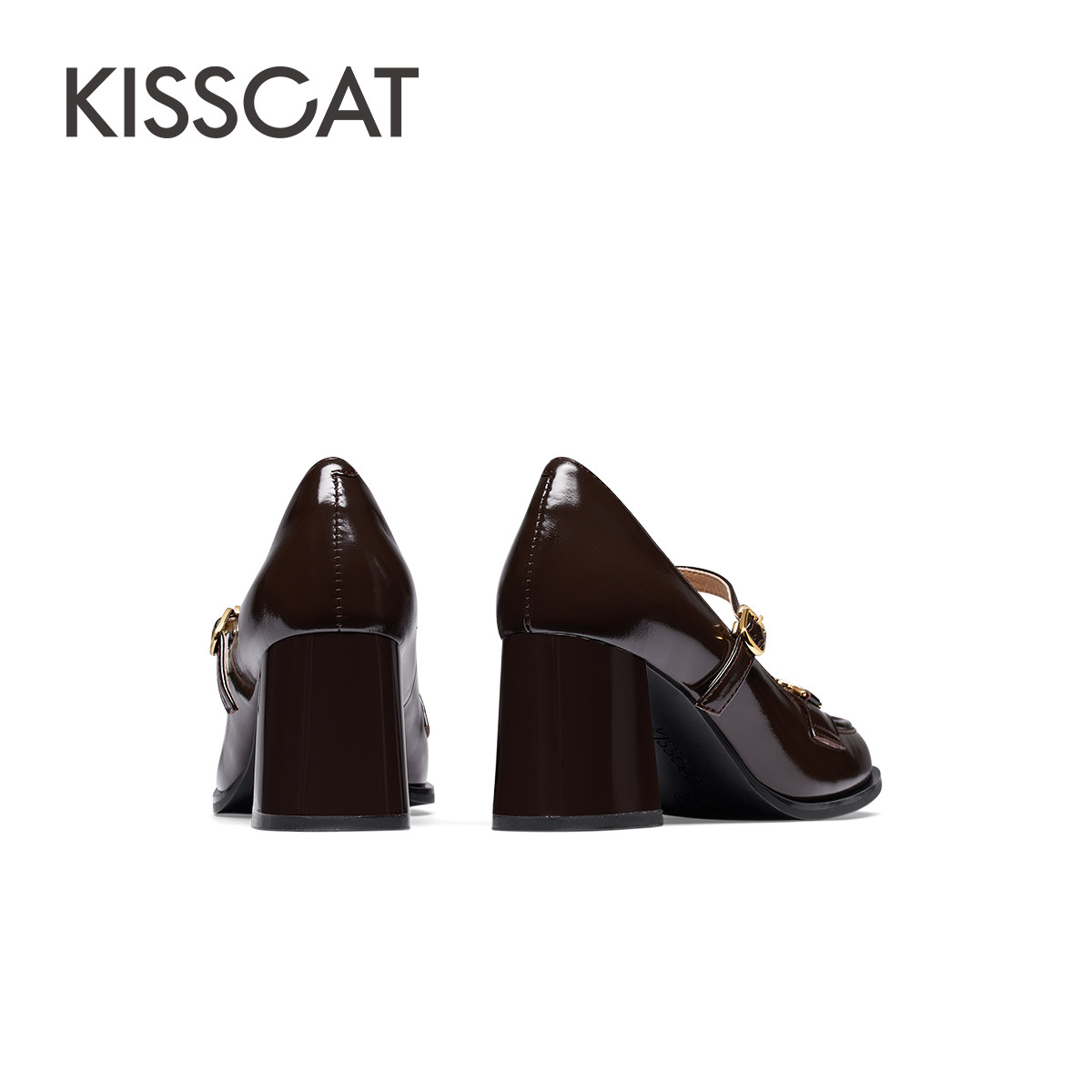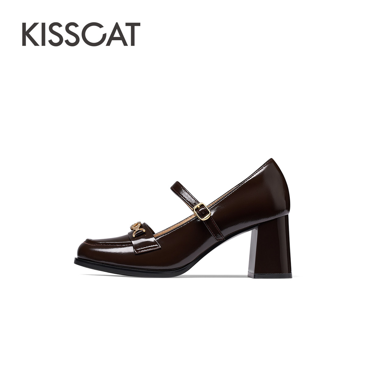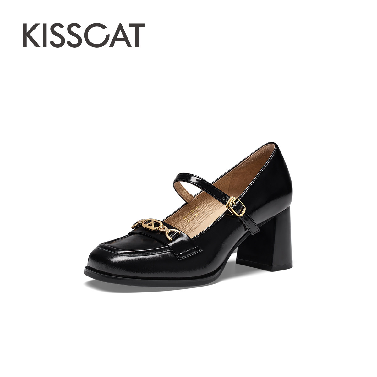 KISSCAT接吻猫秋季真皮粗高跟单鞋女士法式复古一字带玛丽珍鞋女