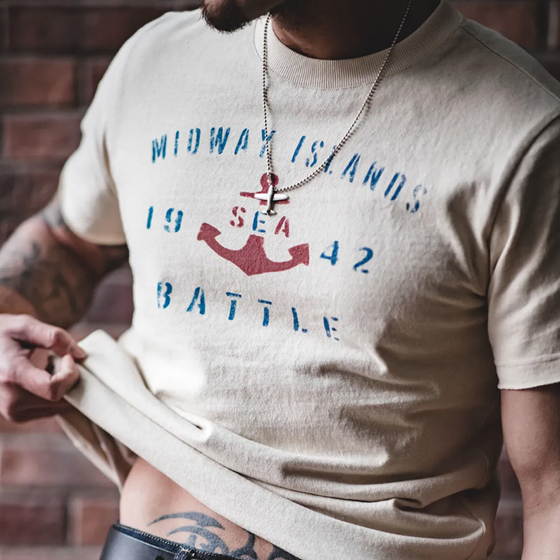 马登工装日系复古船锚印花棉籽壳短袖TEE正肩半袖字母圆领T恤男夏