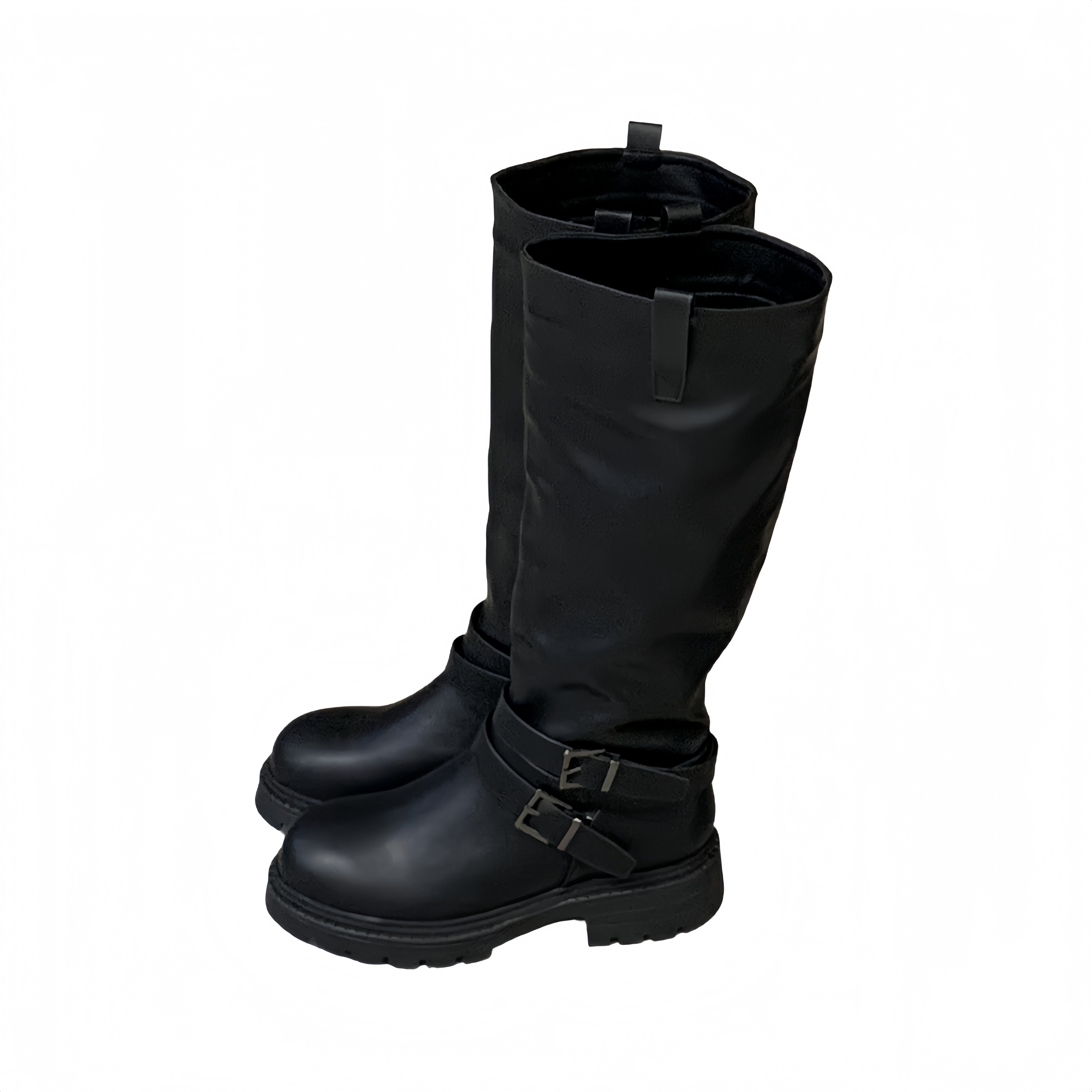 圆头复古高筒骑士靴女秋冬2025新品显瘦皮带扣粗跟厚底长筒靴