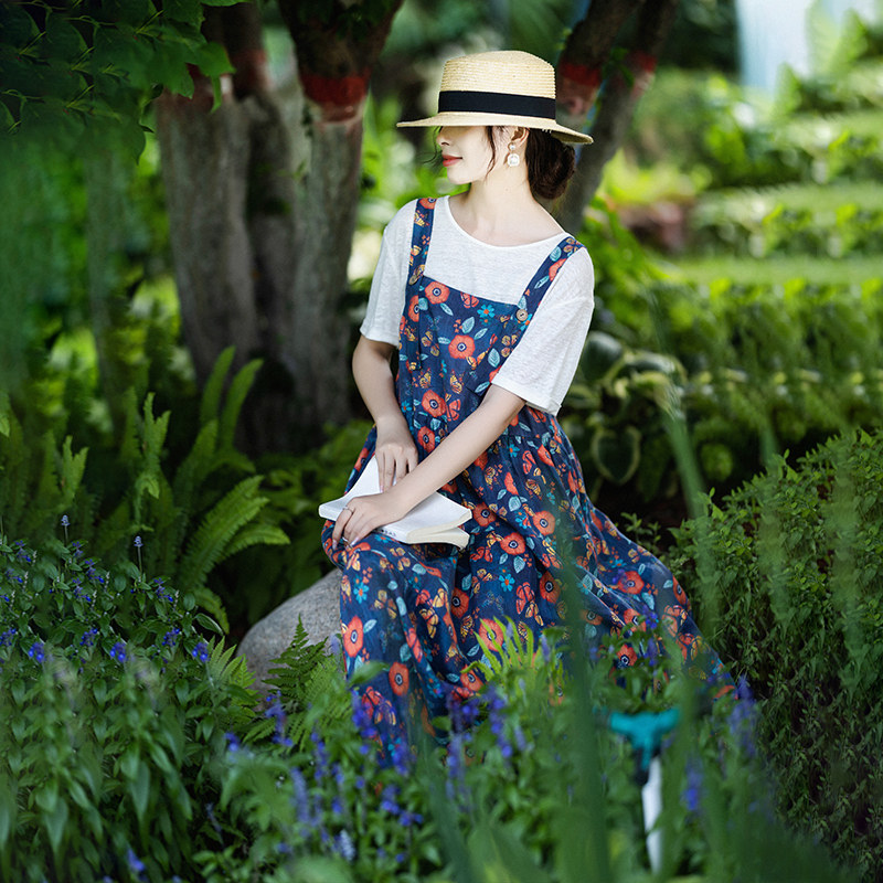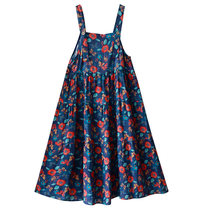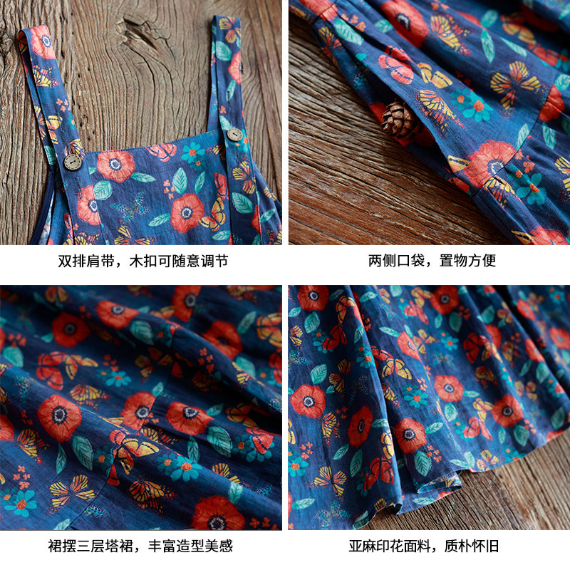 7折【花影藏夏】文艺复古吊带连衣裙女夏季亚麻印花宽松背带裙子