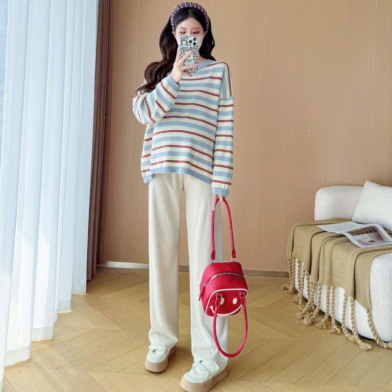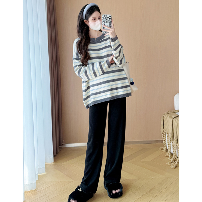 孕妇套装秋冬2025新款灰色条纹针织毛衣时尚宽松上衣裤子两件套女