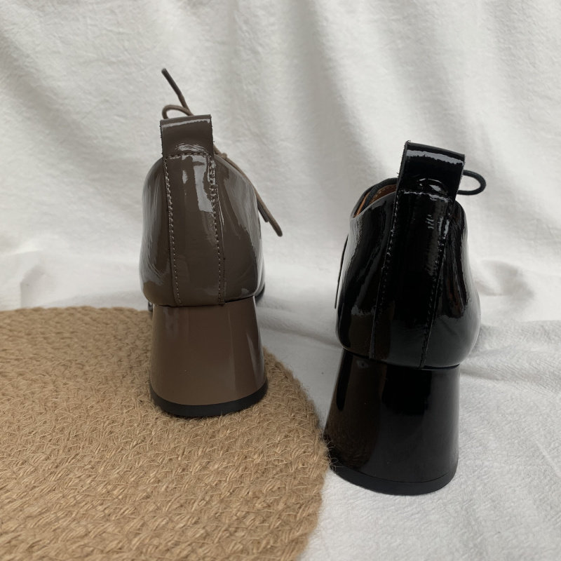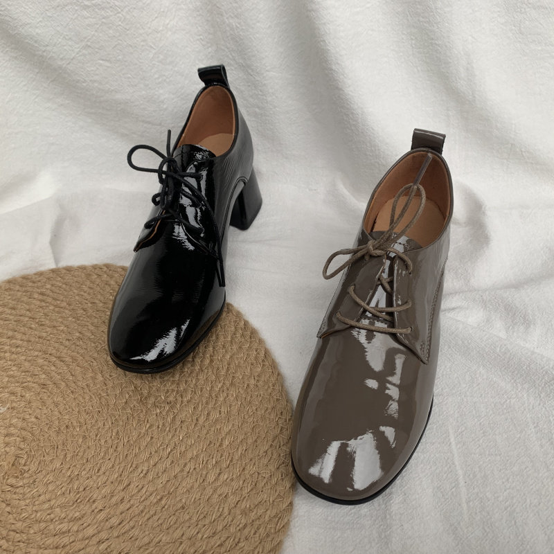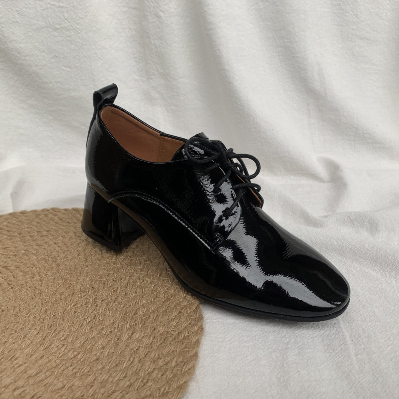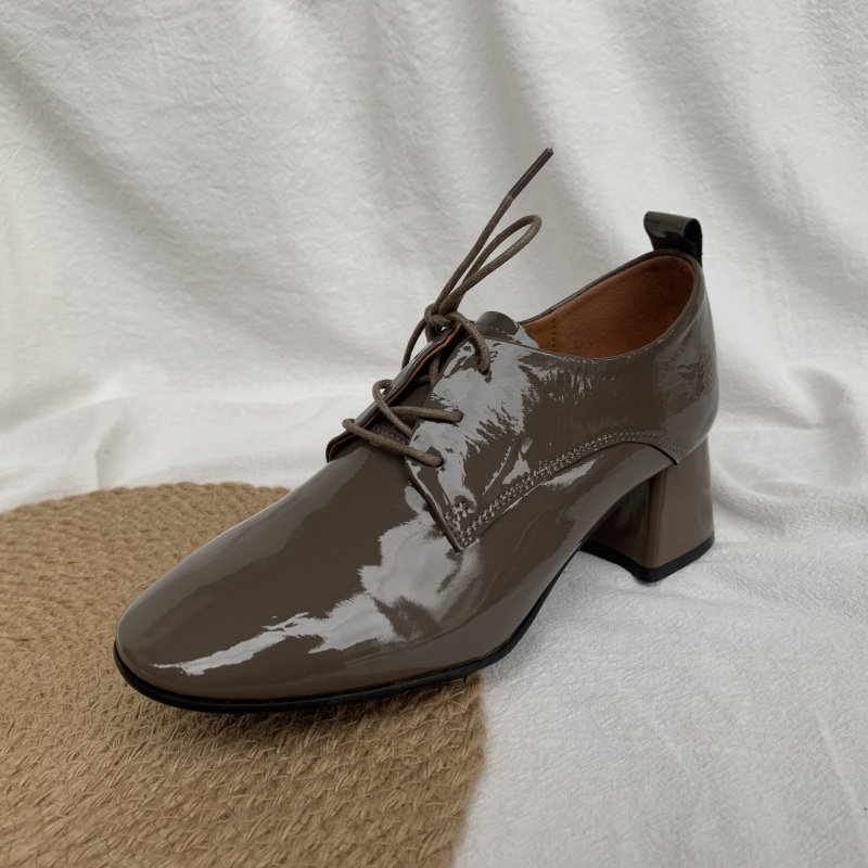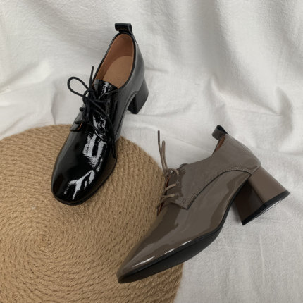 2025春新款断码处理真皮女鞋时尚高跟圆头粗跟深口系带漆皮女单鞋