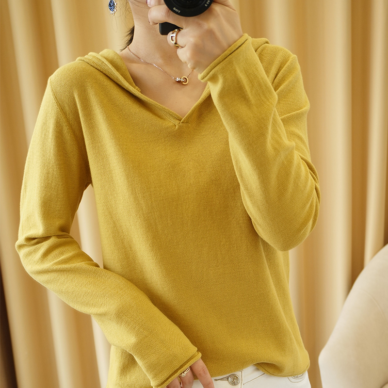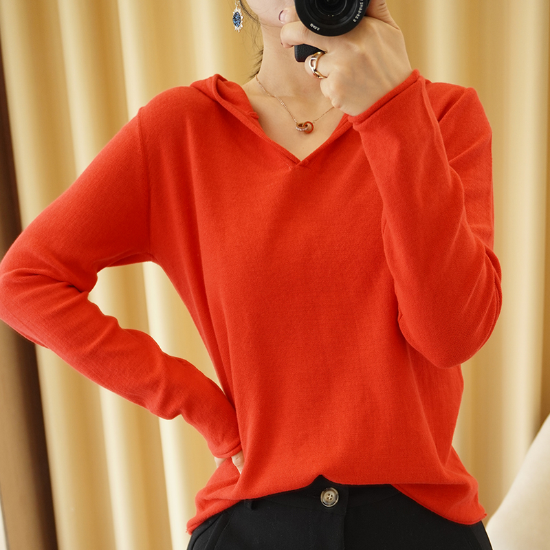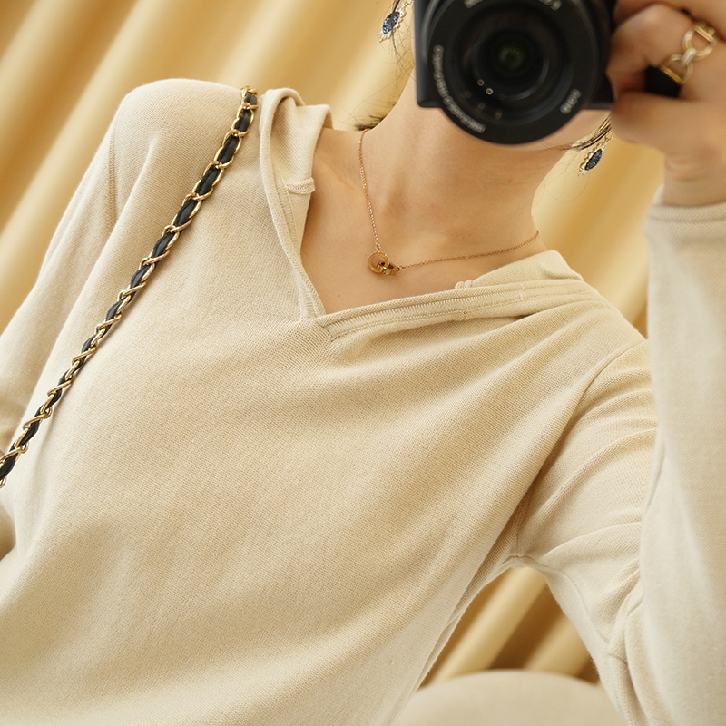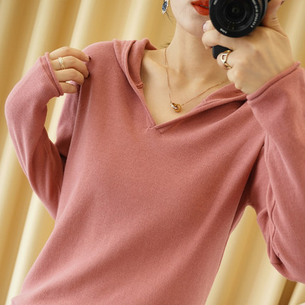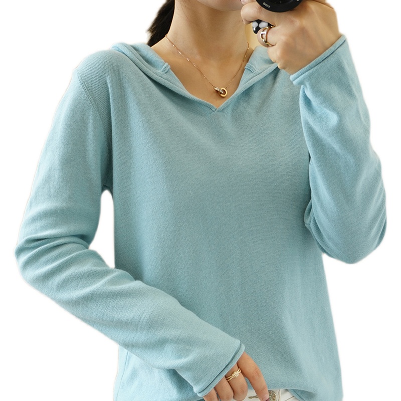 秋冬新款 100%全棉线连帽套头针织衫女长袖线衣宽松休闲帽衫上衣