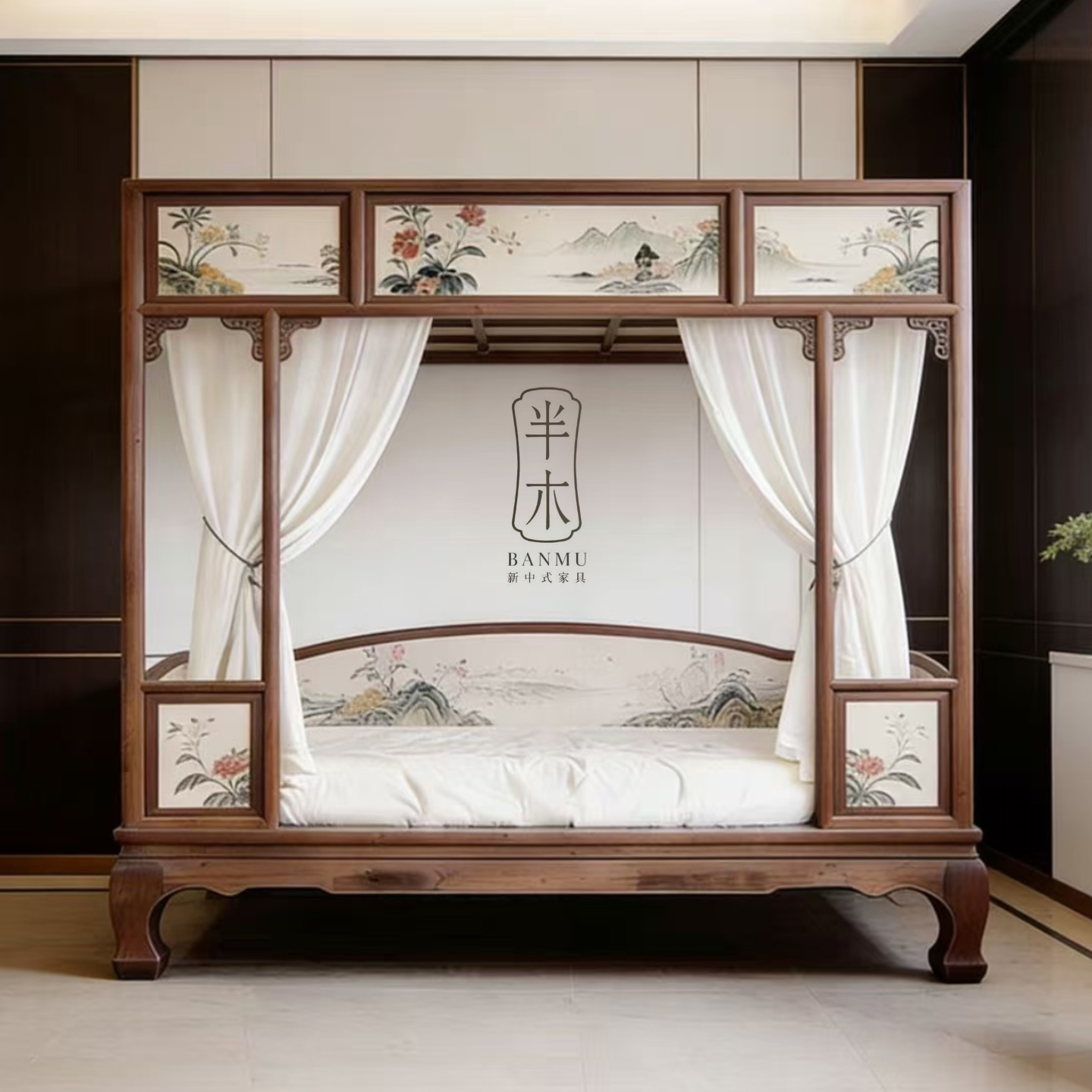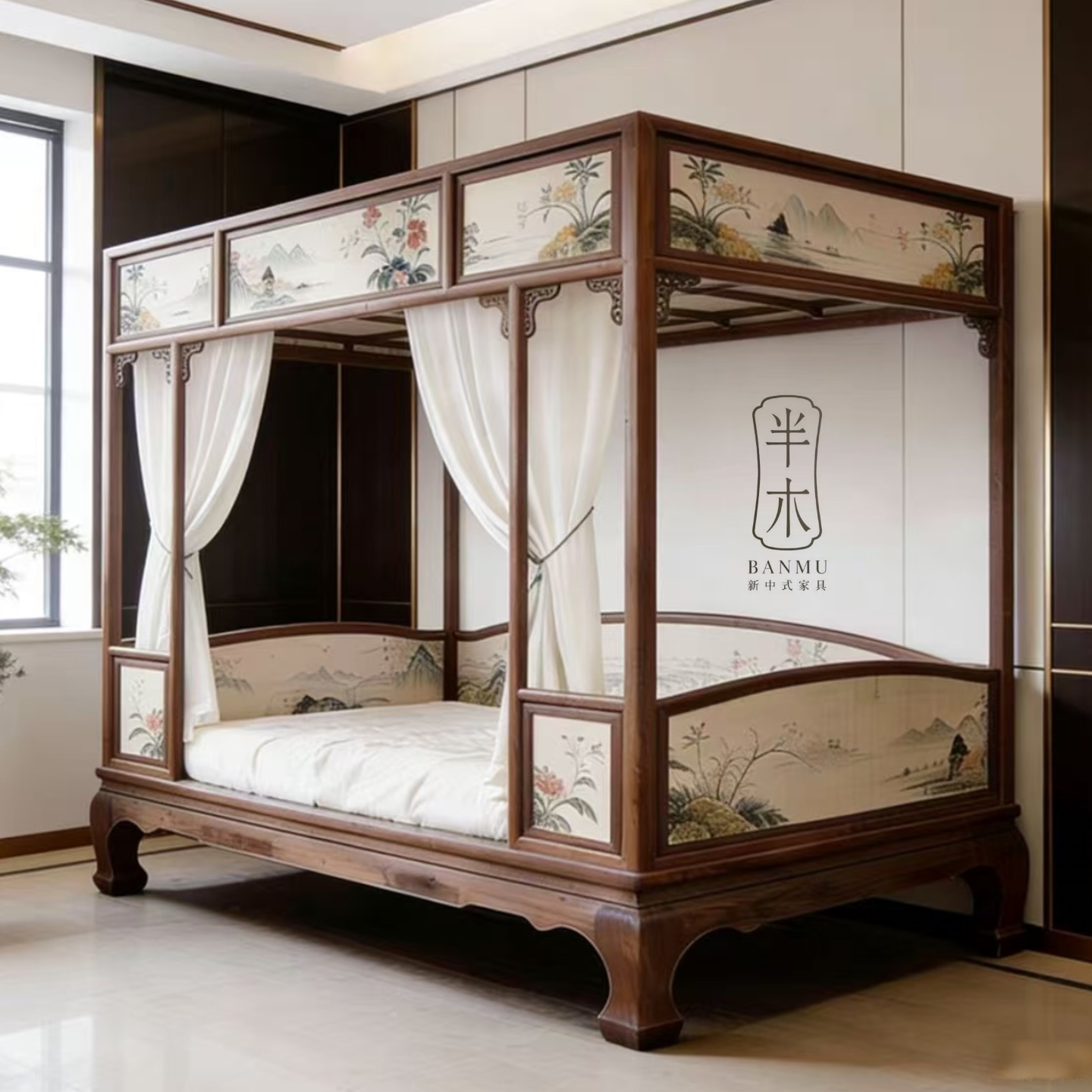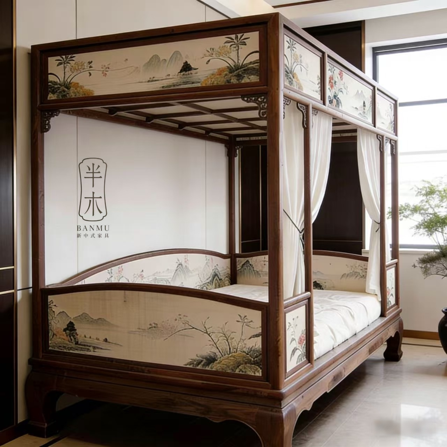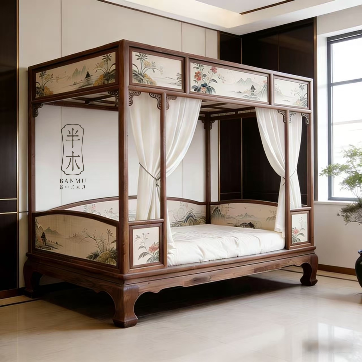 古典彩绘实木四柱床架子床宋式美学酒店民宿卧室双人床实木床定制