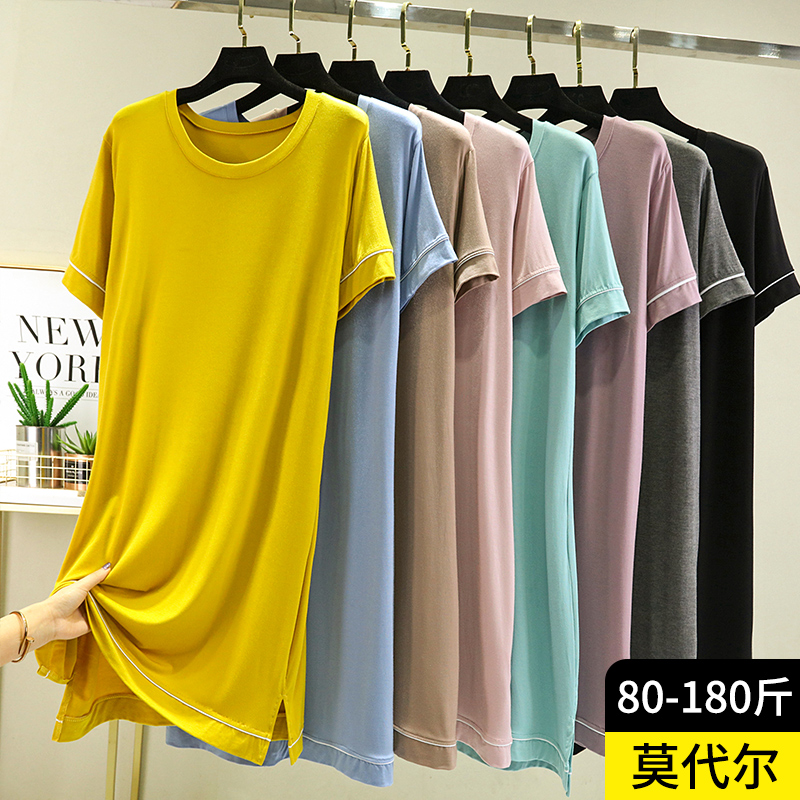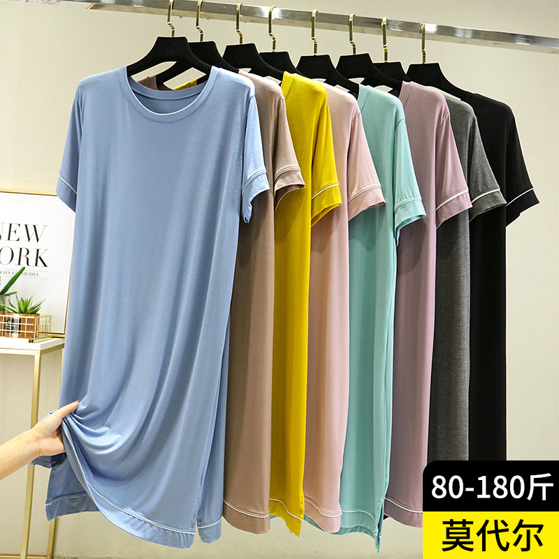 宽松莫代尔睡裙女夏季薄款短袖连衣裙百搭大码中长款半袖家居裙