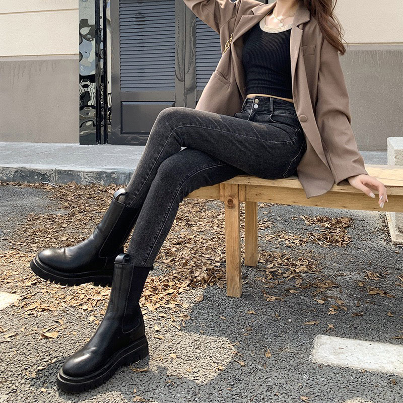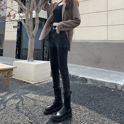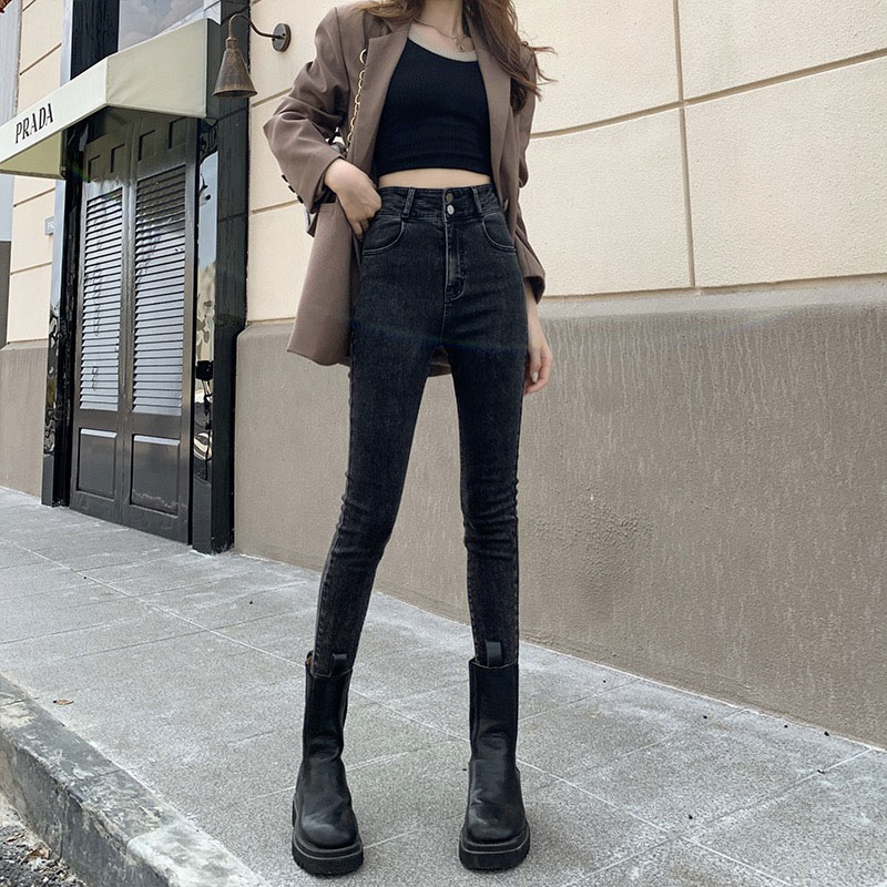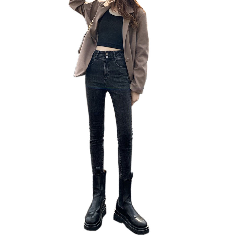 双扣高腰小脚牛仔裤女修身百搭早春高腰黑灰弹力九分紧身铅笔裤子