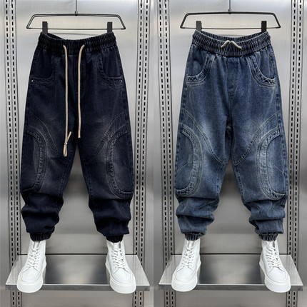 男裤2024春秋新款水洗拼接牛仔裤青年时尚潮牌宽松束脚痞帅工装裤