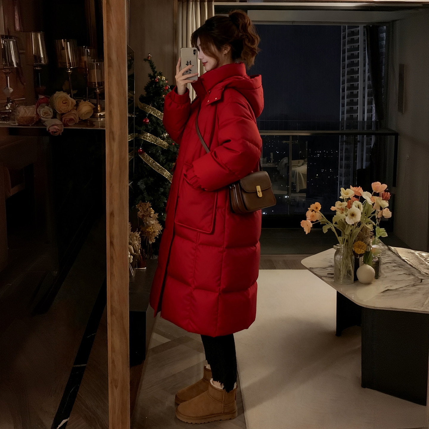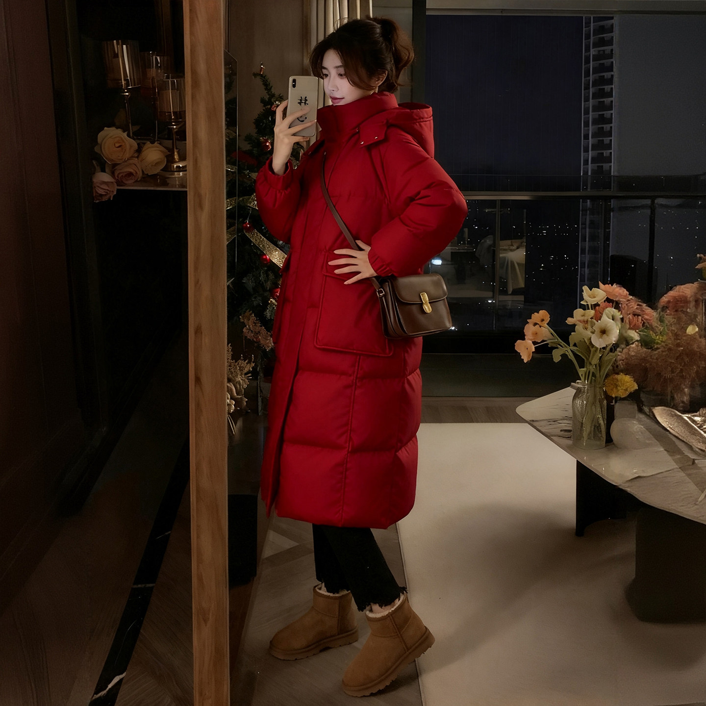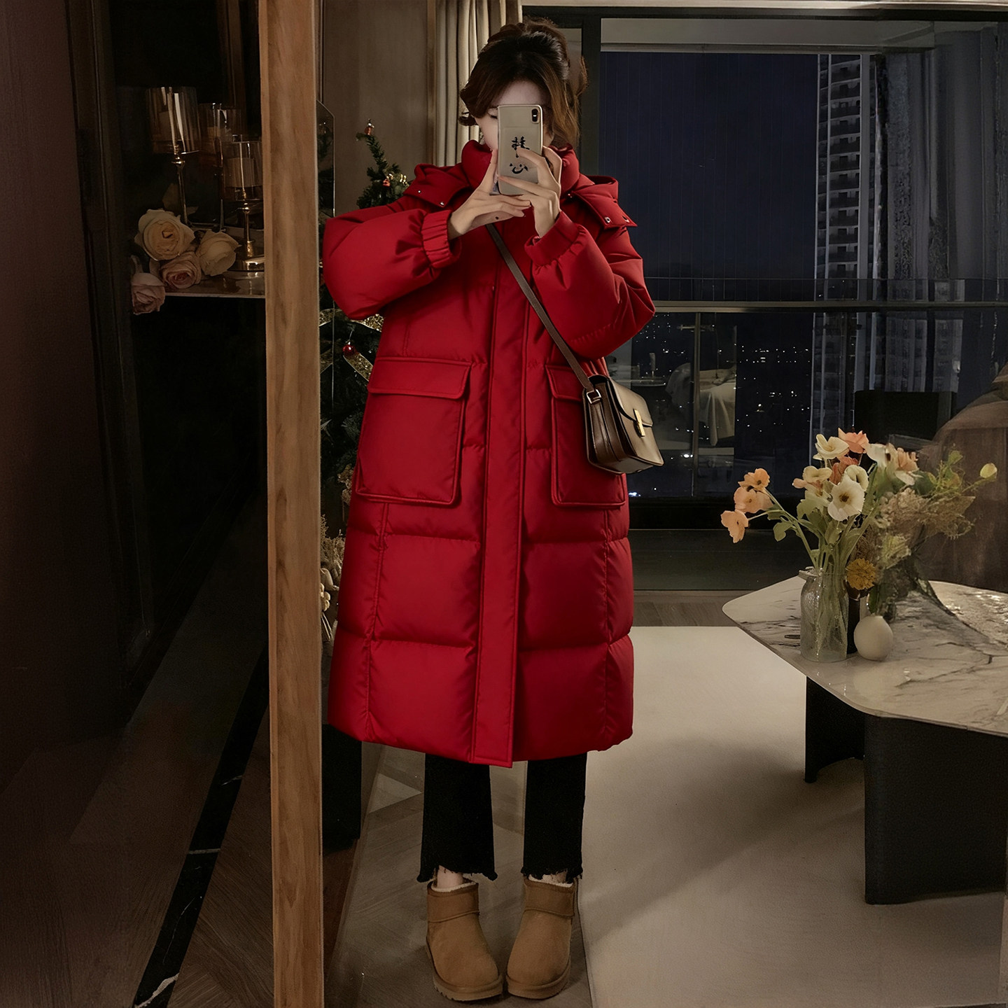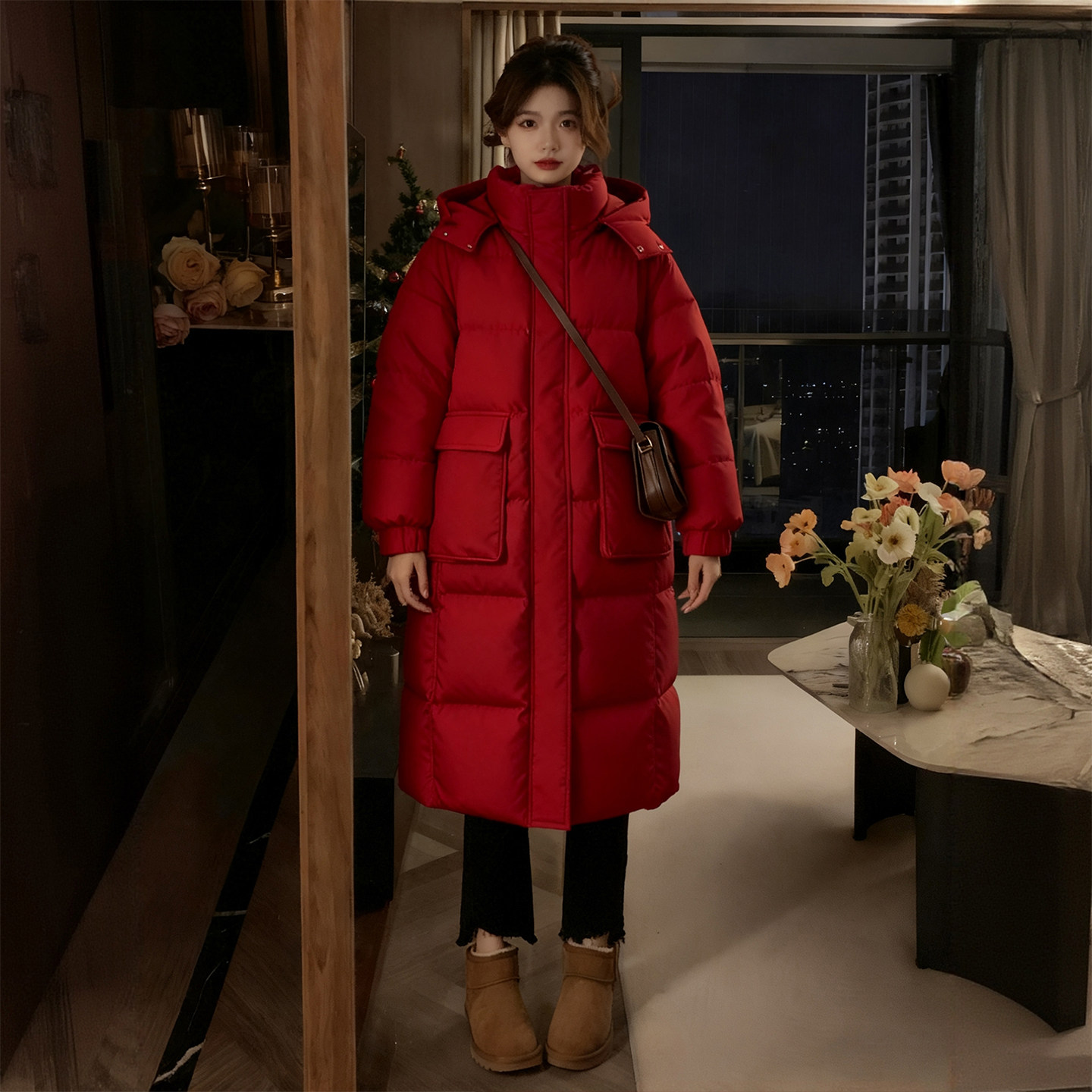 胖mm大码女装红色休闲百搭羽绒棉服女冬季加厚保暖中长款连帽棉衣