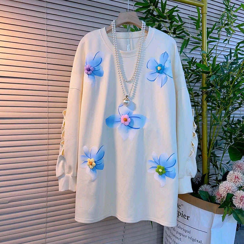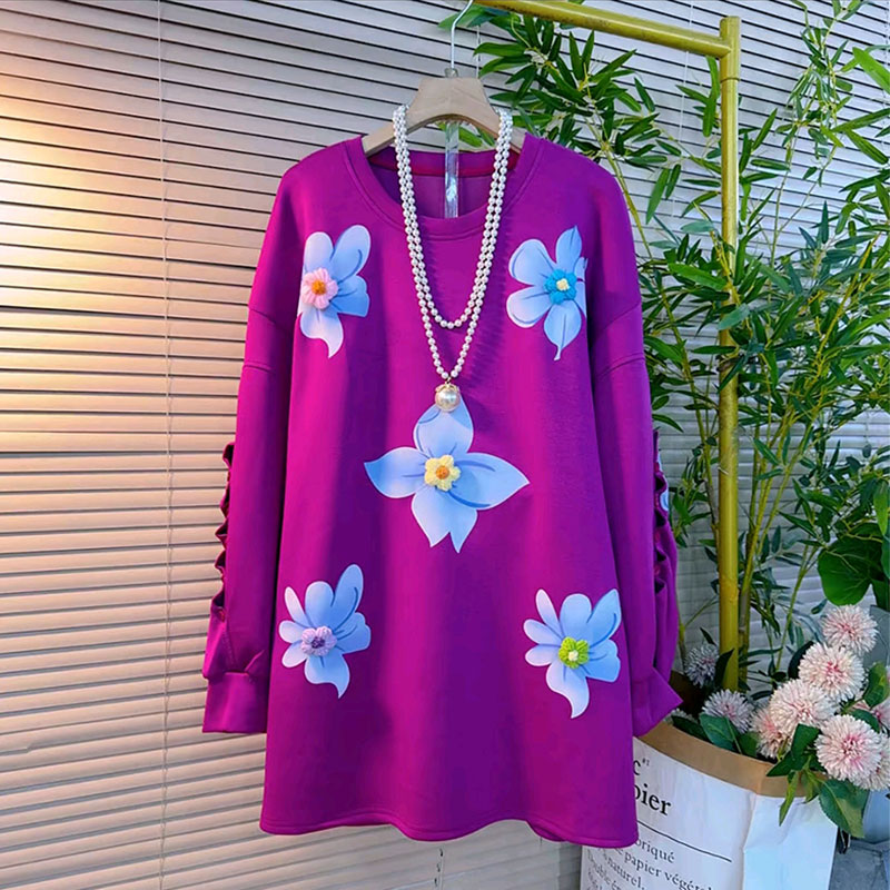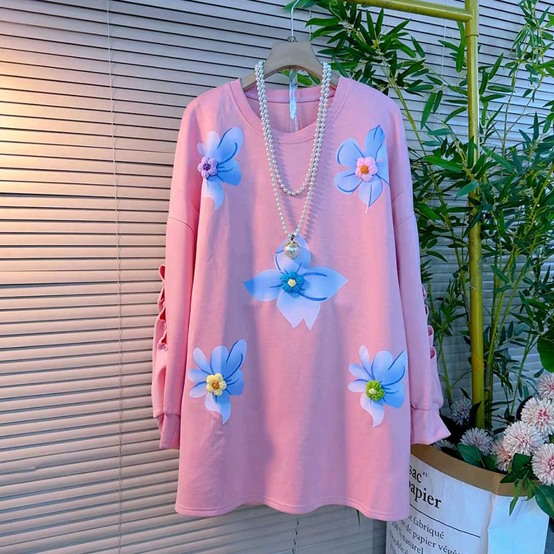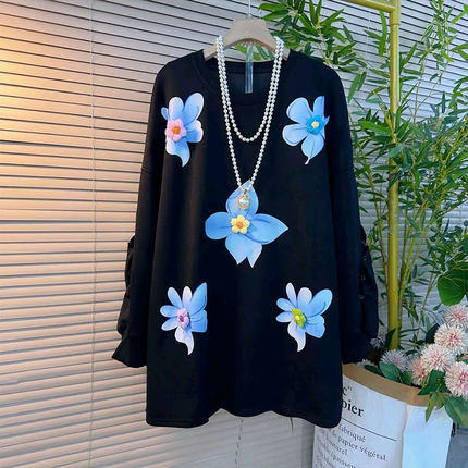 胖妹妹大码女装秋季新款中长卫衣设计感立体花朵减龄百搭休闲上衣