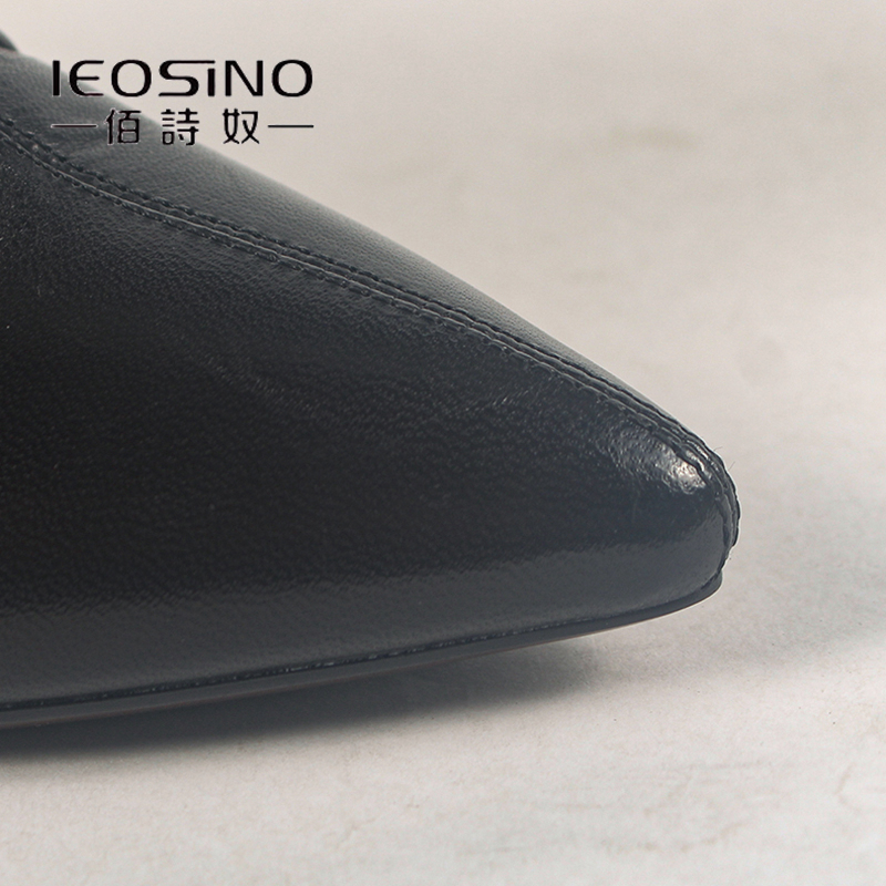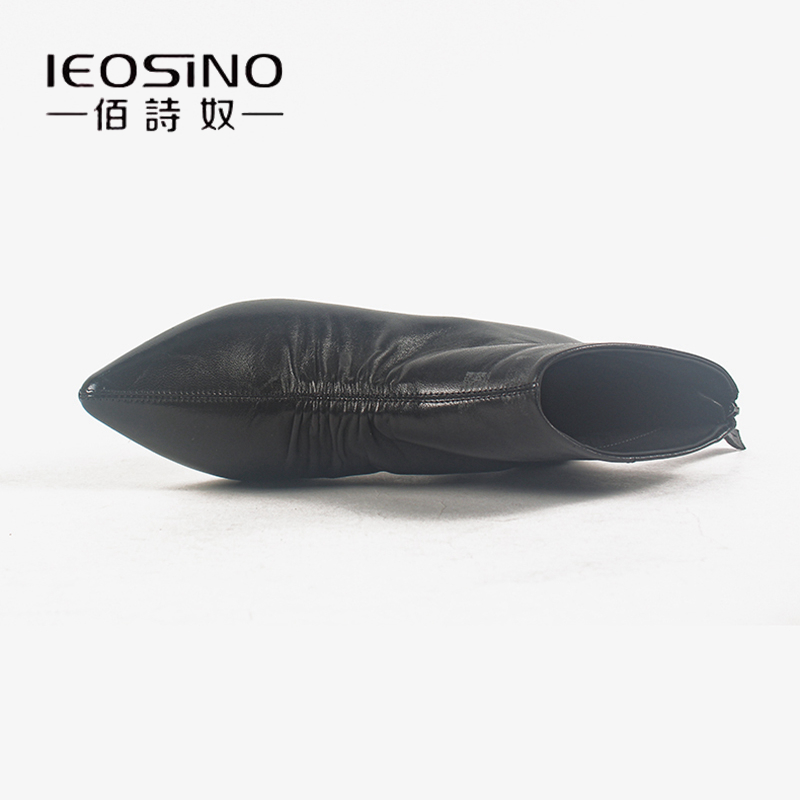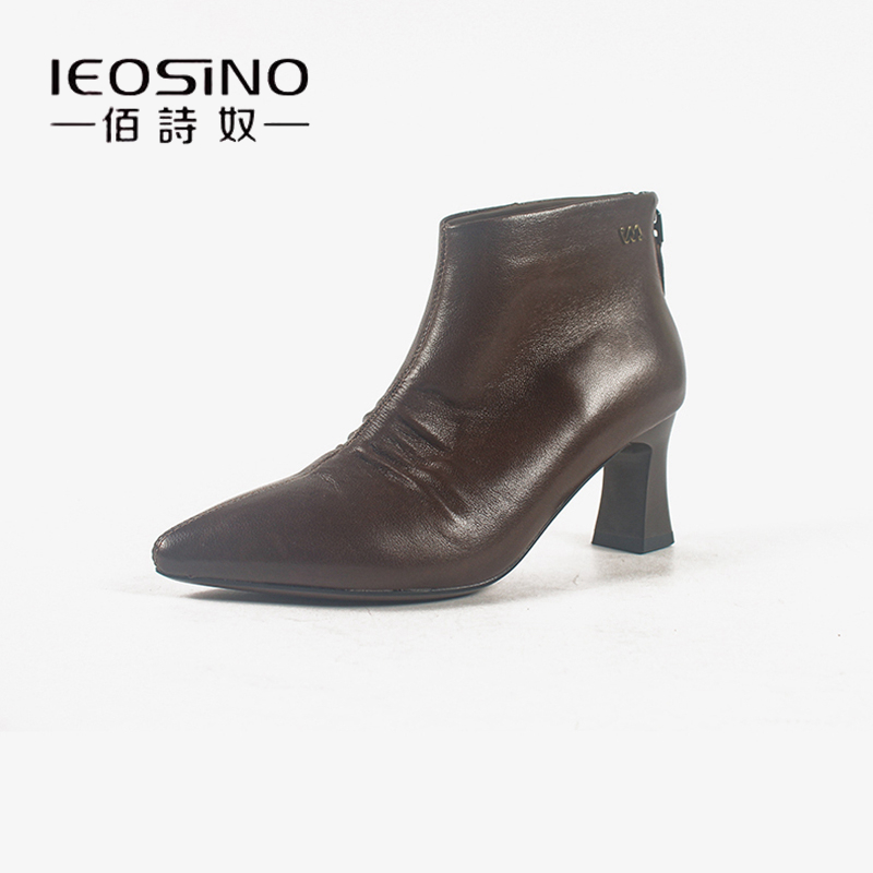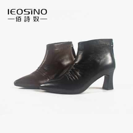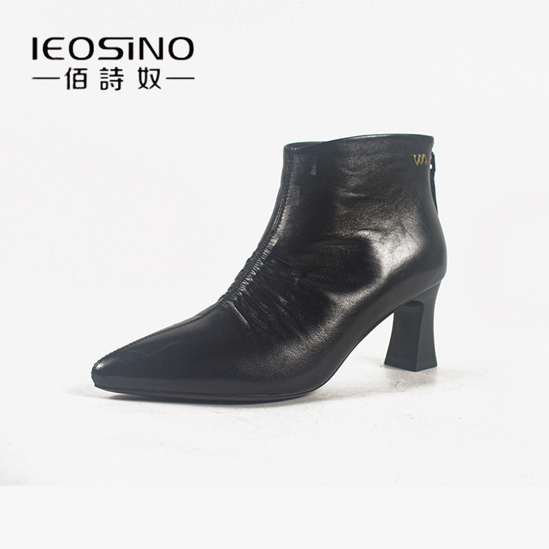 佰诗奴2025年秋冬季新款真皮法式小羊皮女靴尖头粗跟褶皱时装短靴