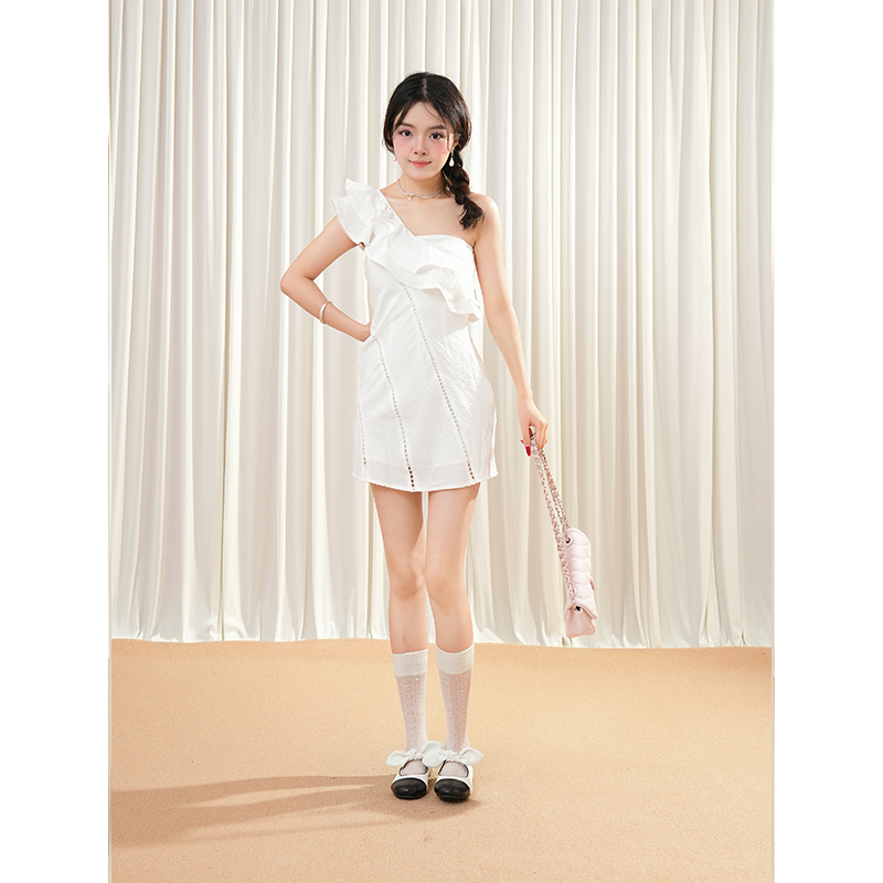 甜美可爱斜肩荷叶边连衣裙女2025夏季新款海边度假风修身显瘦短裙