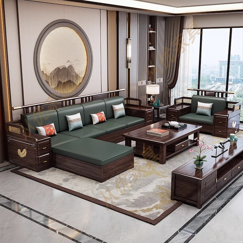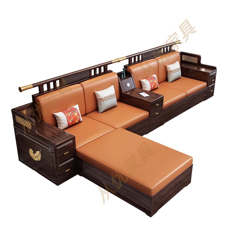 新中式别墅高端客厅家具组合大户型全实木贵妃储物乌金木实木沙发