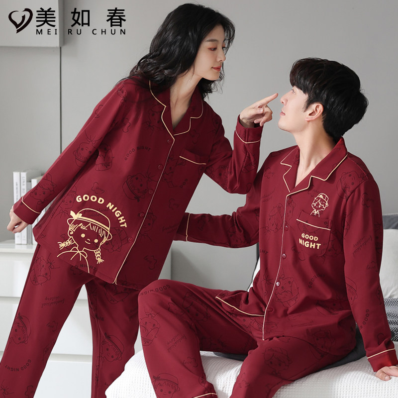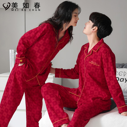 莱卡【高档面料】情侣睡衣秋冬季纯棉新婚红色结婚家居服男女套装