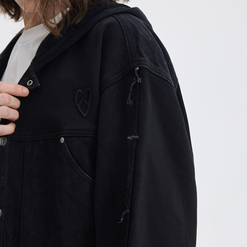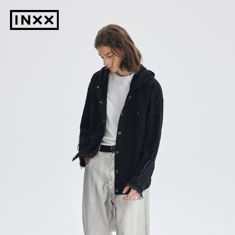 INXXAPYD 牛仔拼接卫衣夹克外套男时尚做旧街头风连帽上衣