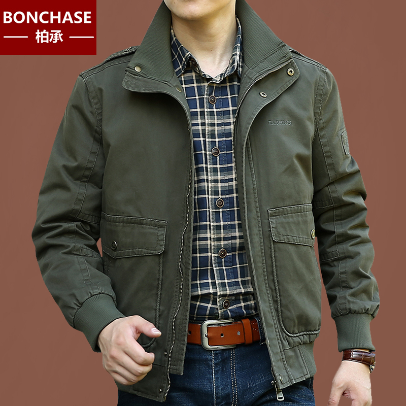 春秋新款男士纯棉夹克宽松大尺码中年立领工装上衣服男装休闲外套