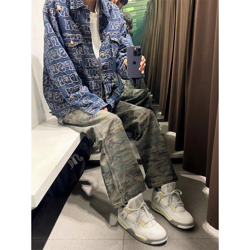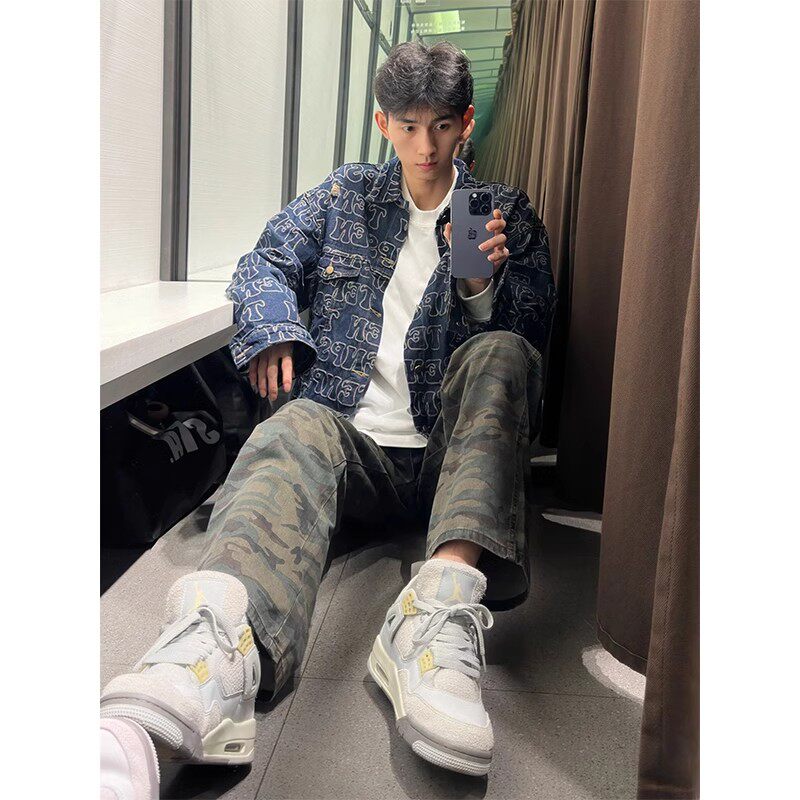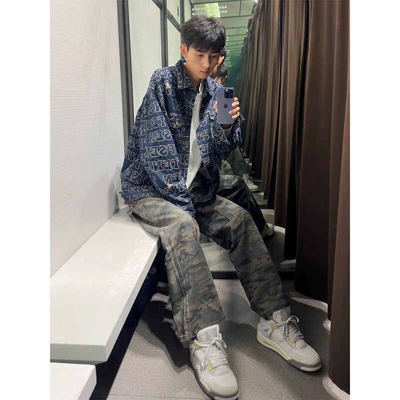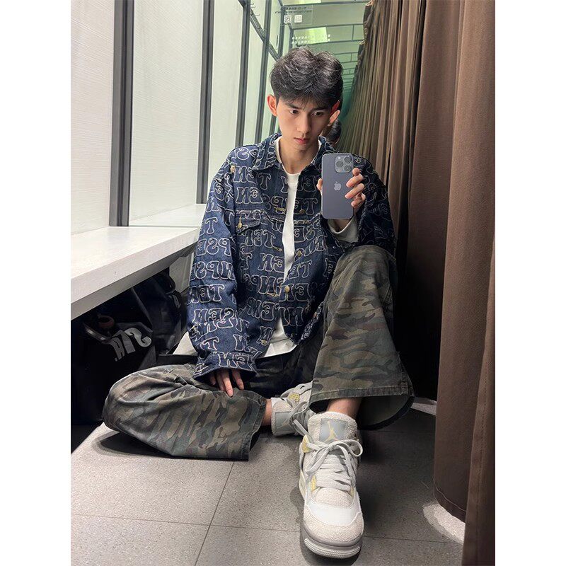 深蓝色提花破洞牛仔外套男春秋季潮牌高级感痞帅翻领工装复古夹克