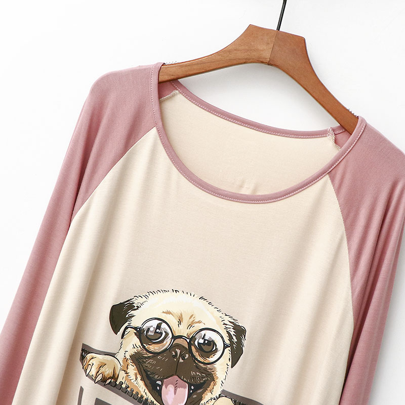 睡裙女春夏 莫代尔长袖薄款宽松大码T恤上衣中长款印花连衣裙睡衣