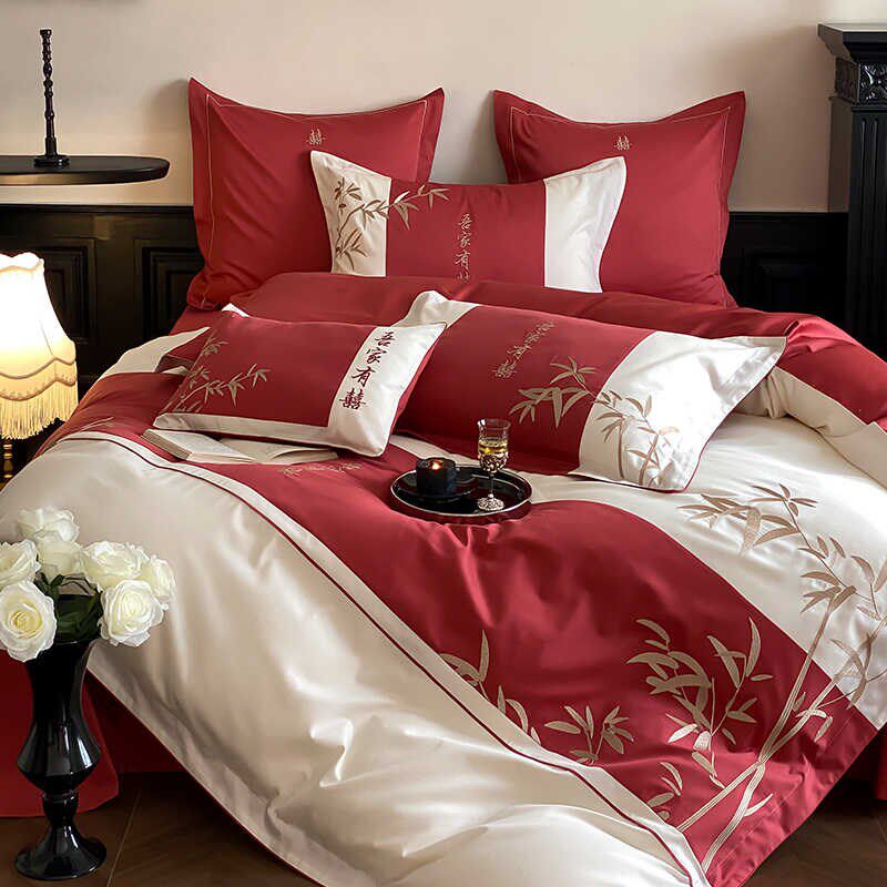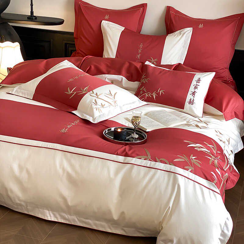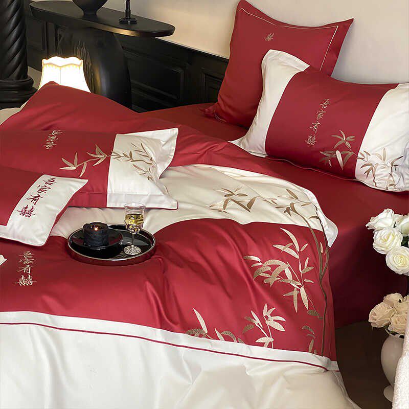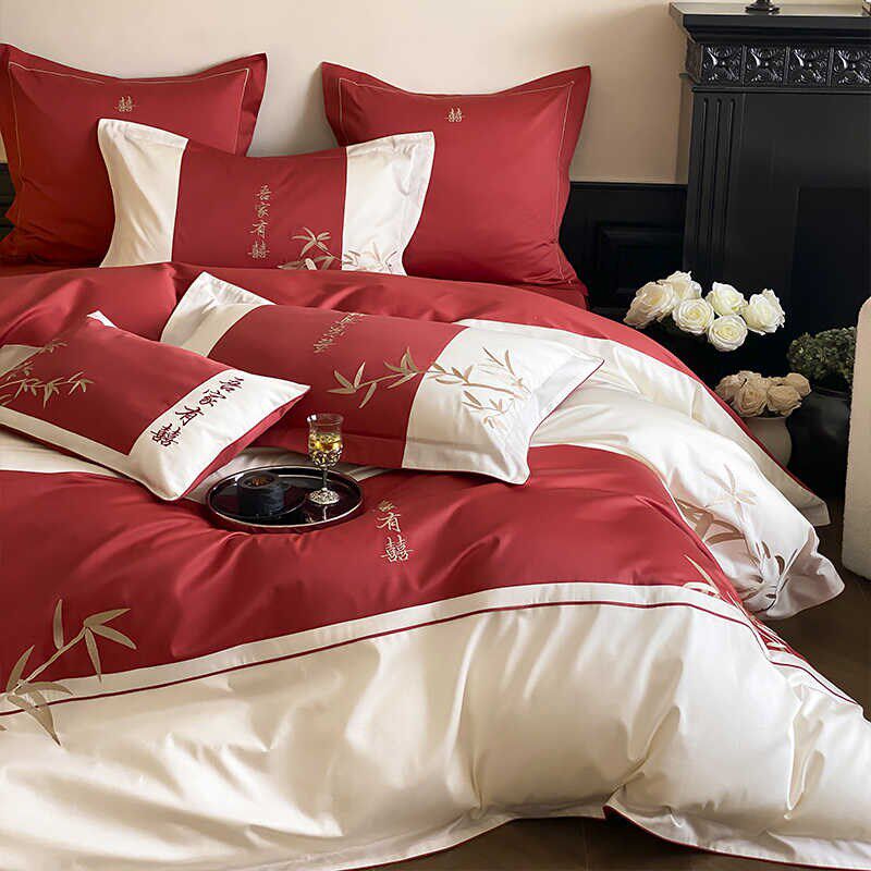 新中式结婚庆纯棉小众四件套浪漫长绒棉被套大红T轻奢床单高端床