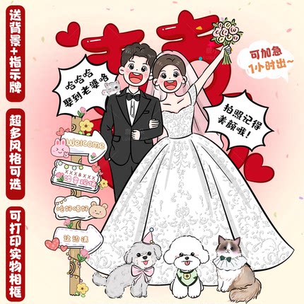 手绘头像Q版情侣婚礼婚纱照定制卡通人物人形立牌迎宾牌请柬设计