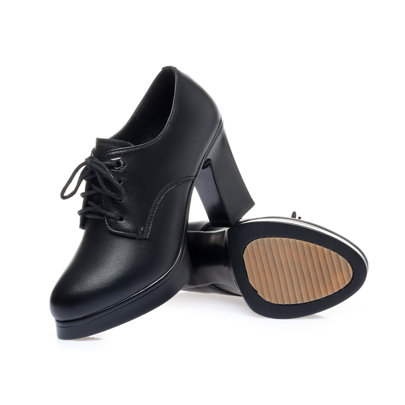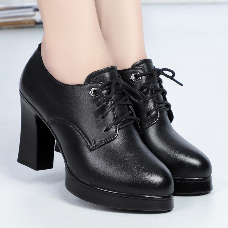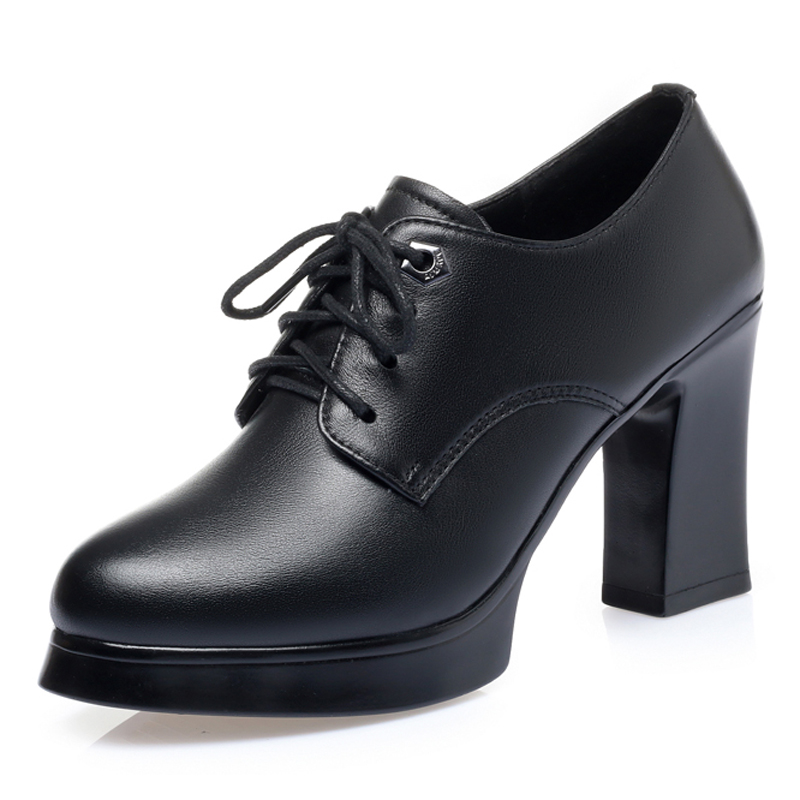 春秋单鞋职业工作鞋女鞋子黑色真皮中跟粗跟系带皮鞋防水台高跟鞋
