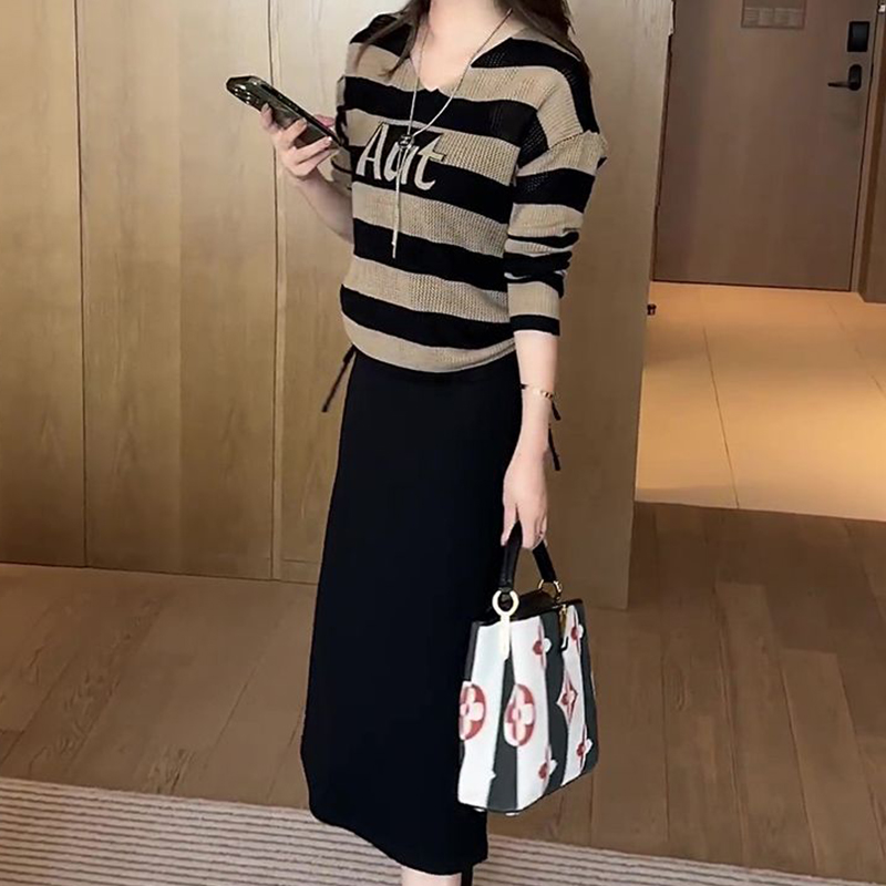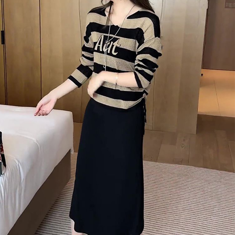 韩系通勤搭配一整套春季新款女条纹针织衫吊带裙今年流行时尚套装