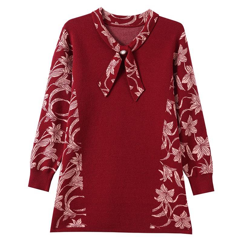 加肥大码飘带领羊毛衫女秋冬妈妈宽松中长款毛衣印花针织打底上衣