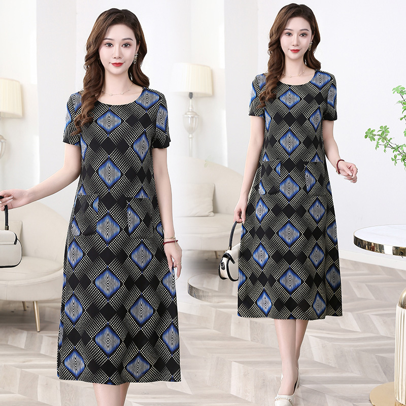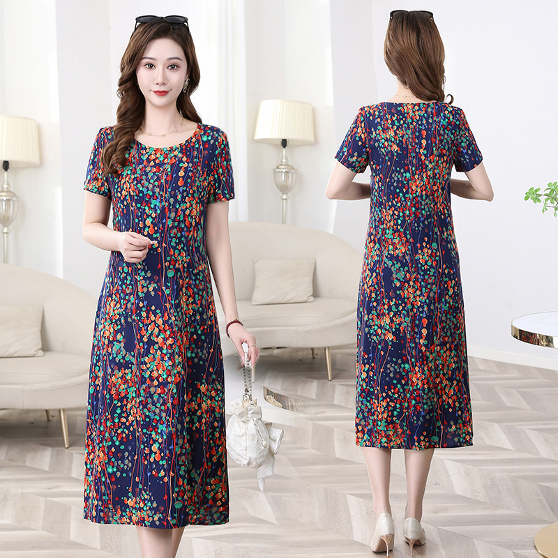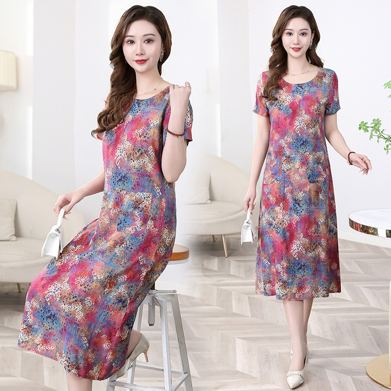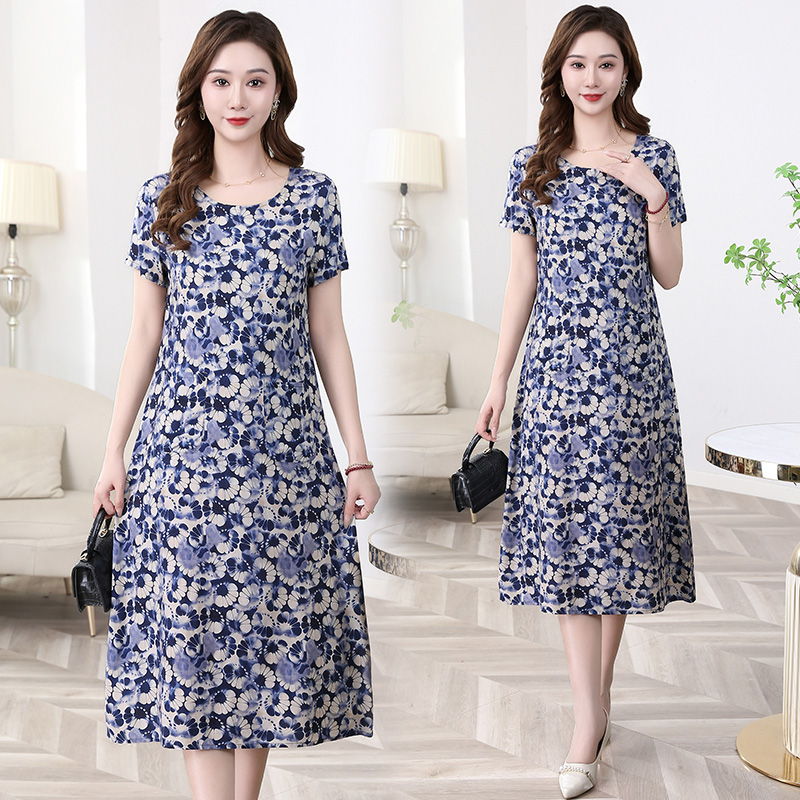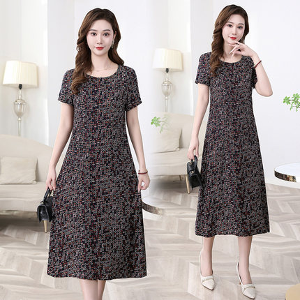 妈妈夏装短袖连衣裙中长款2025新款大码中老年女装棉绸裙子人造棉