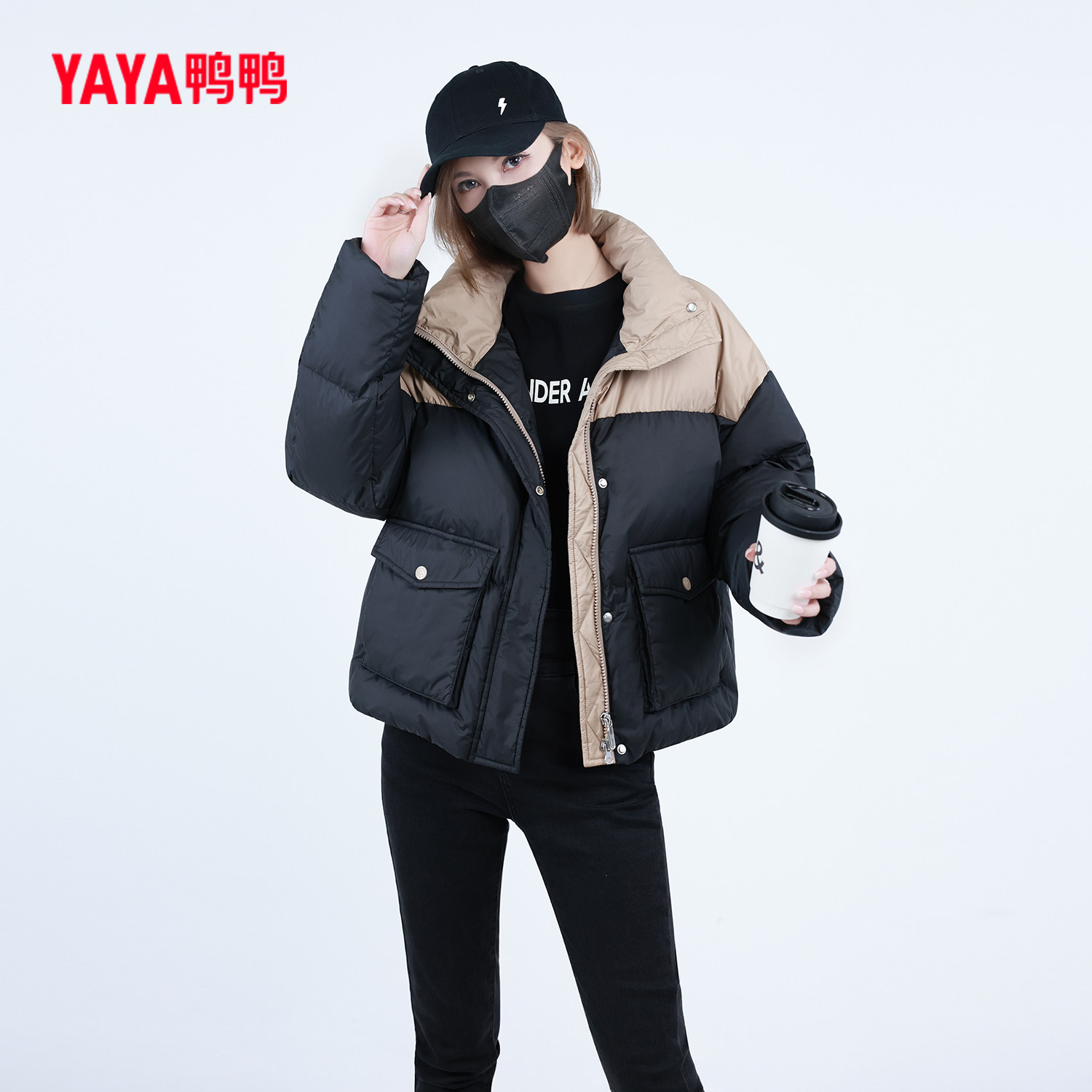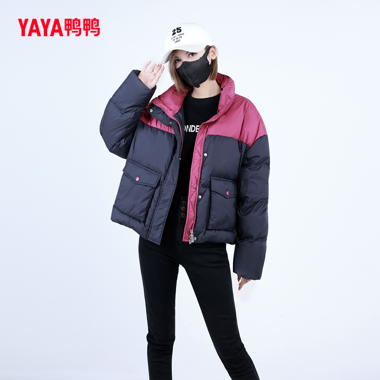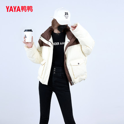 鸭鸭拼色短款立领经典款羽绒服女