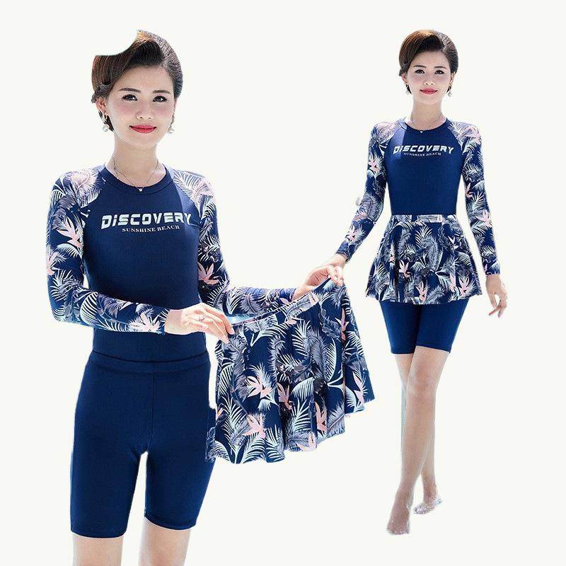 妈妈泳衣女泡温泉保守显瘦遮肚裙式大码分体中老年三件套温泉泳装