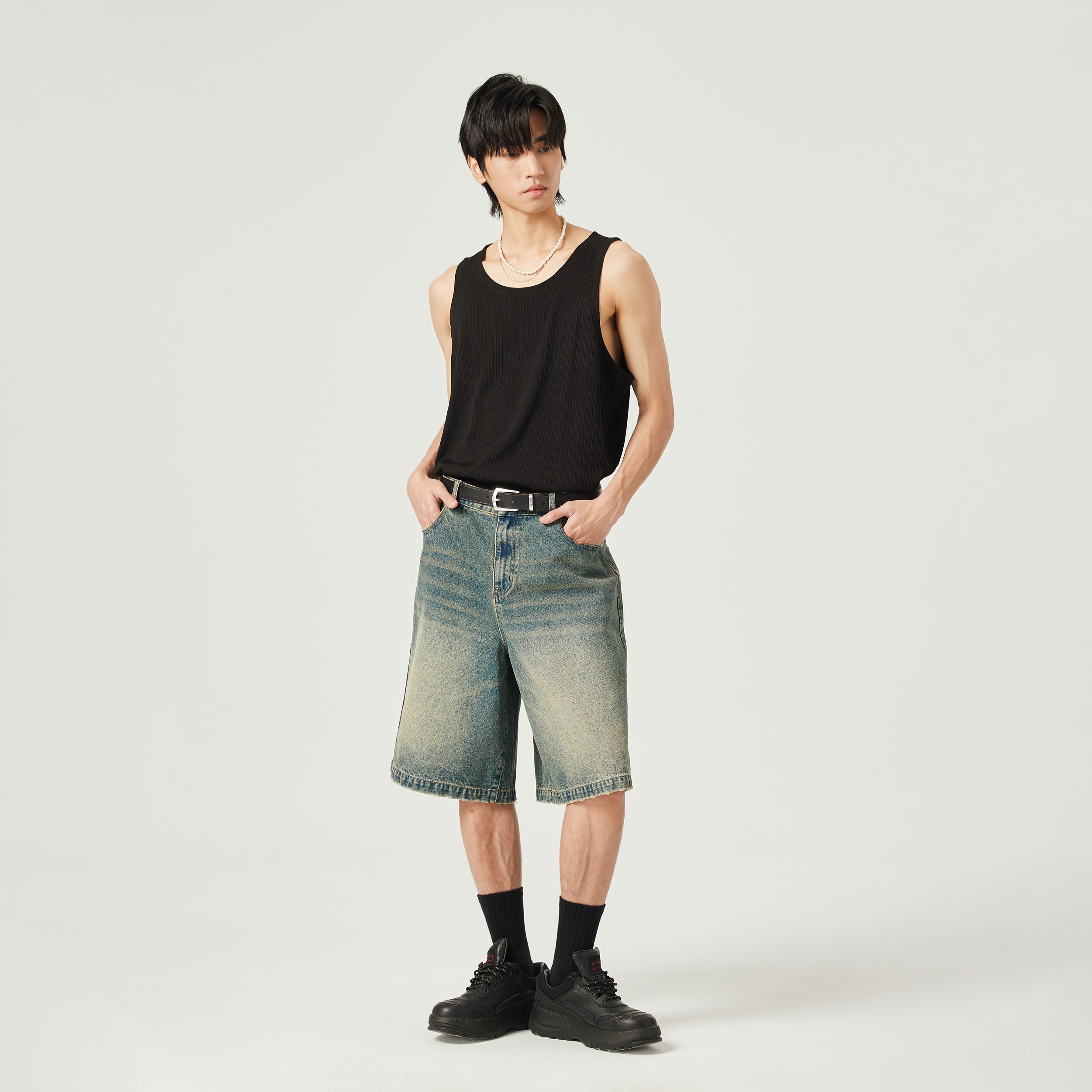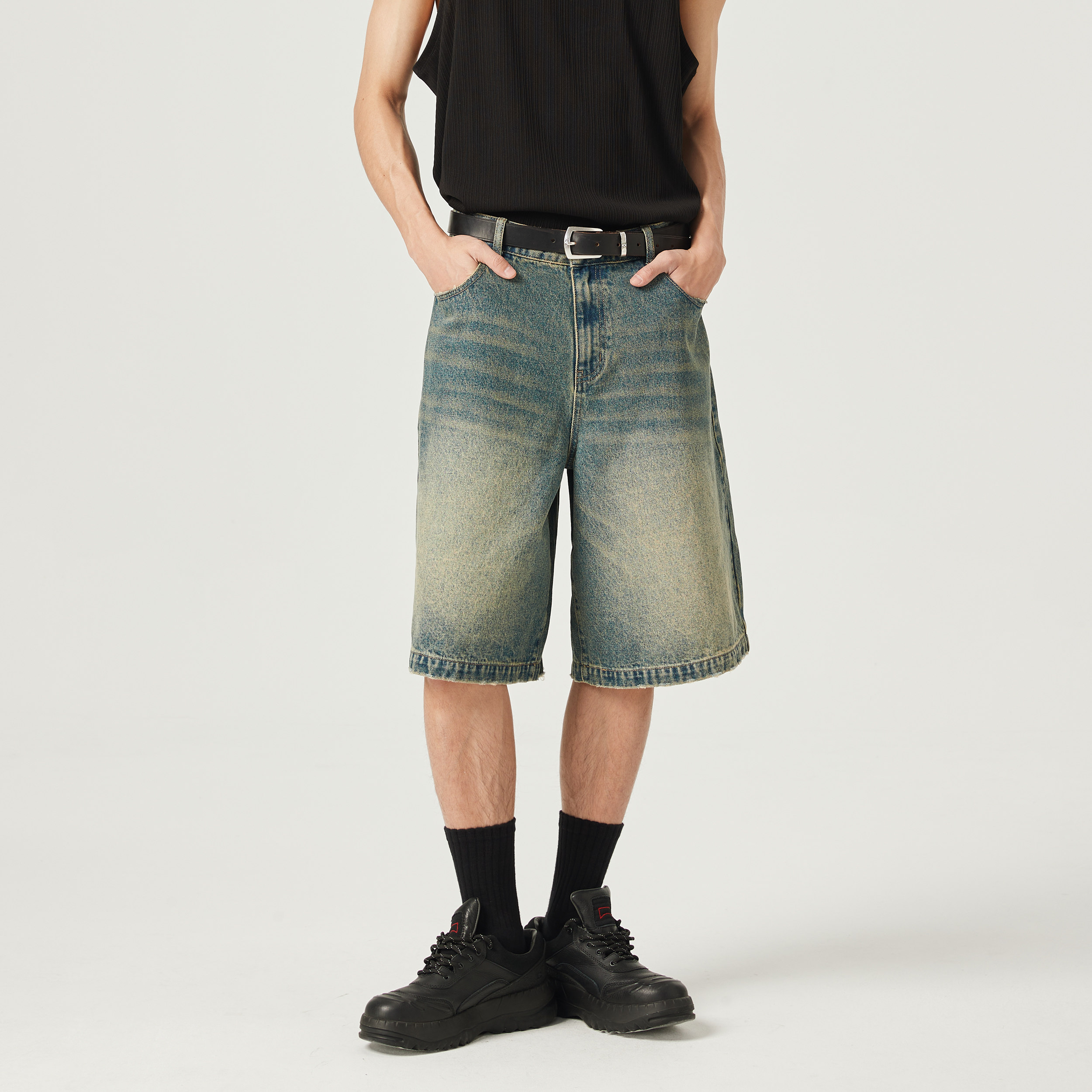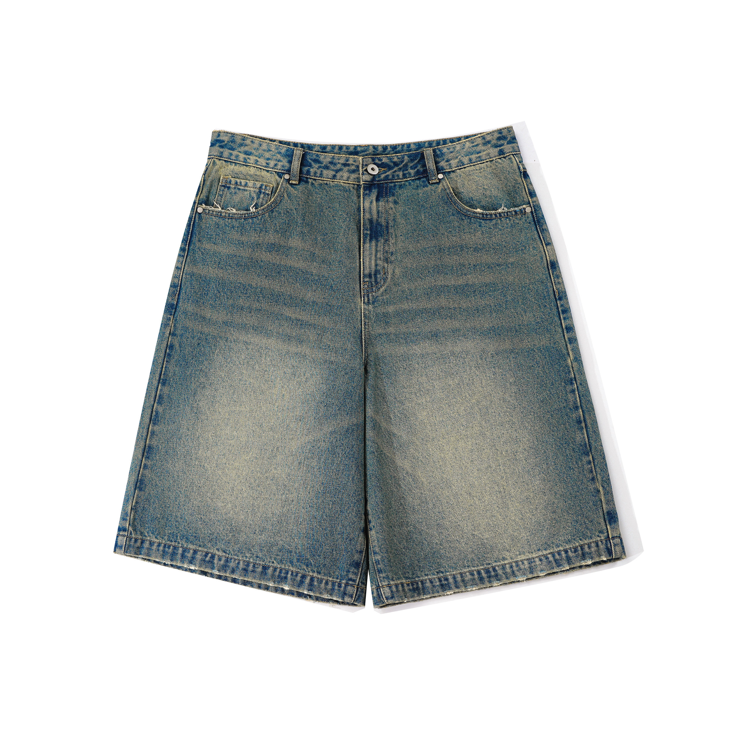 DIMC复古水洗泛黄五分牛仔裤 潮流夏季新款磨边廓形宽松男女短裤