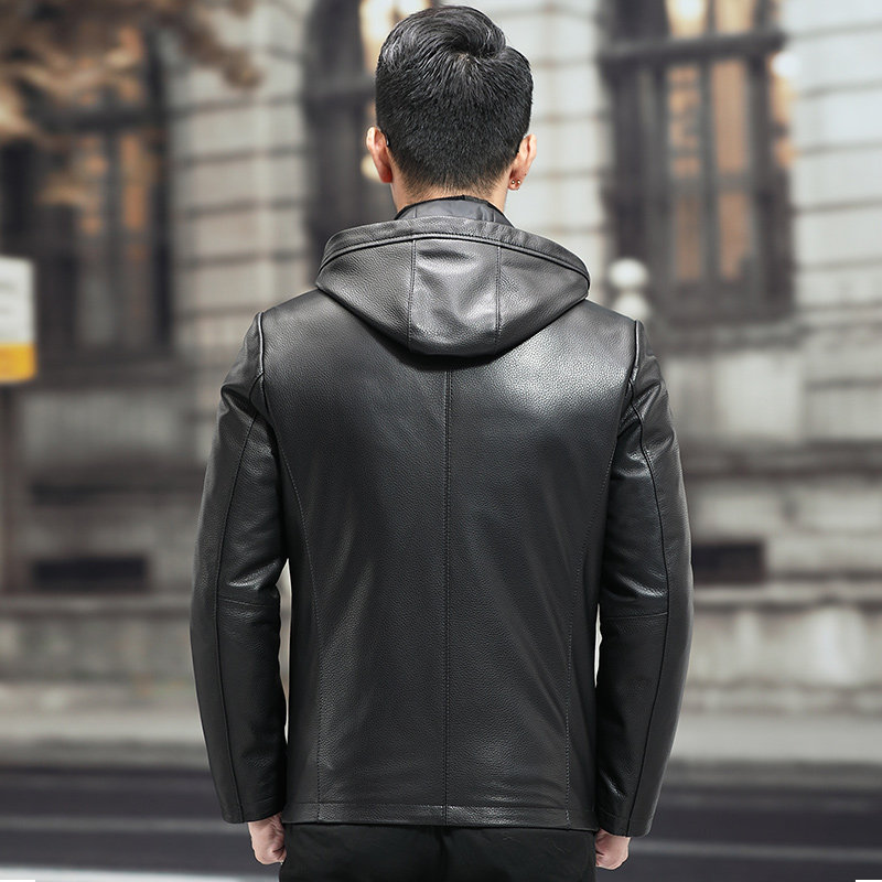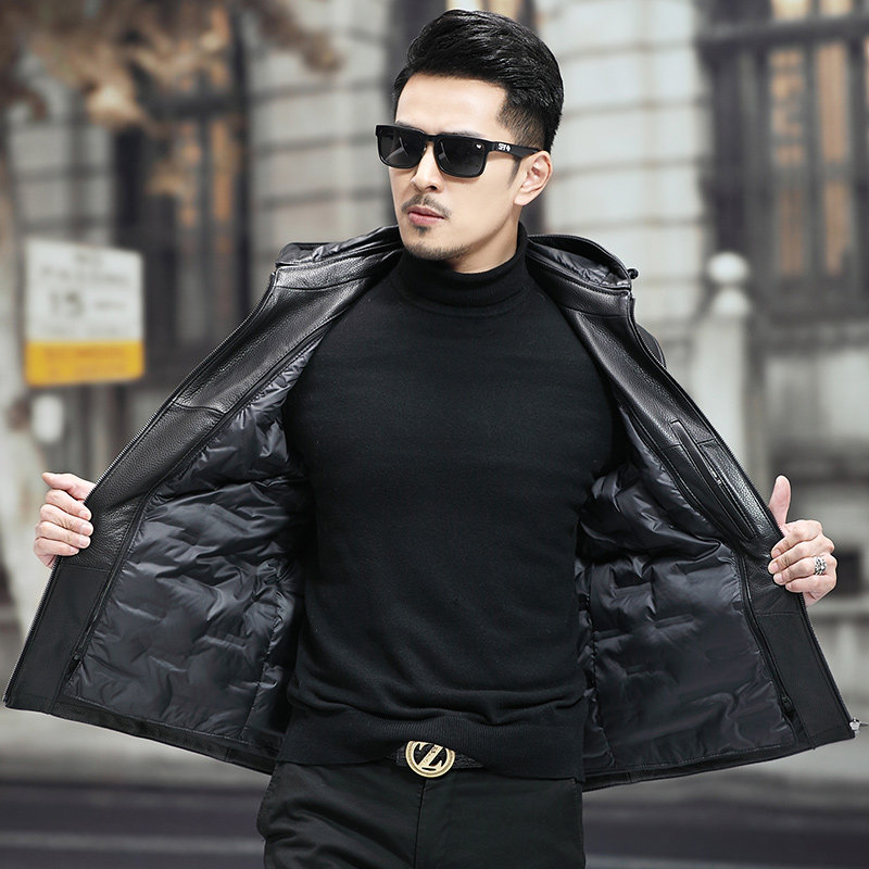 头层鹿纹山羊皮皮衣男士可脱卸帽子青年皮夹克休闲真皮羽绒服外套