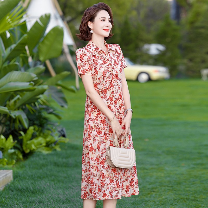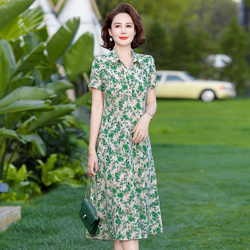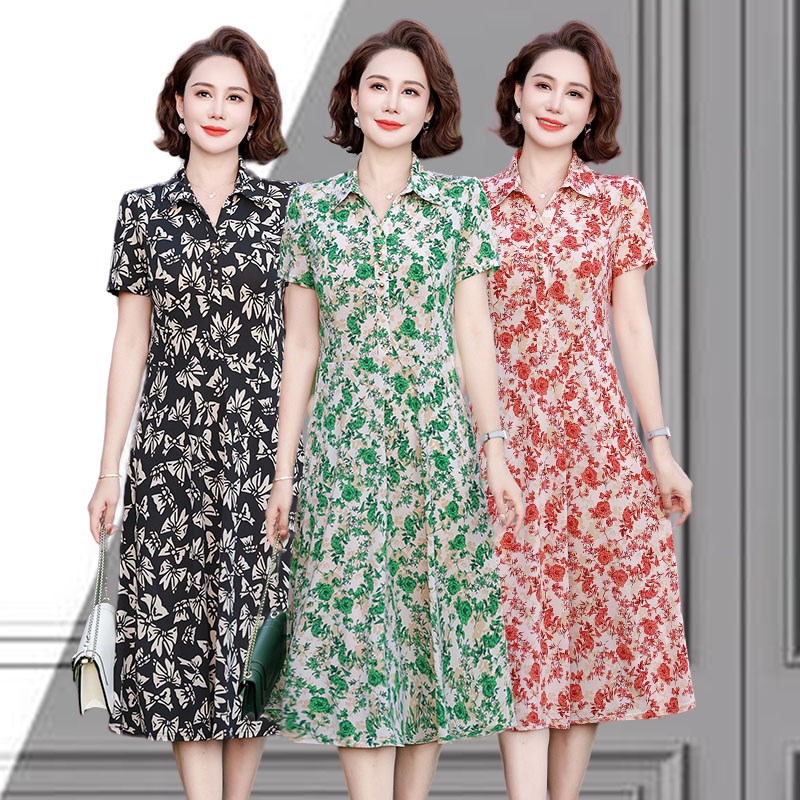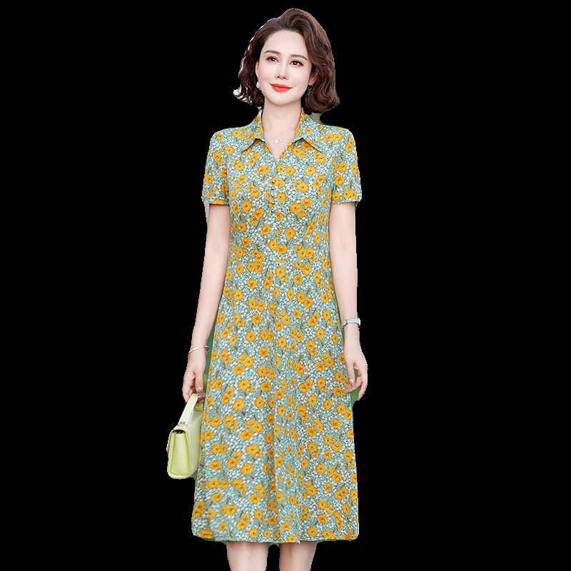 妈妈夏装衬衫连衣裙女2024新款洋气中老年气质显瘦小碎花弹力裙子