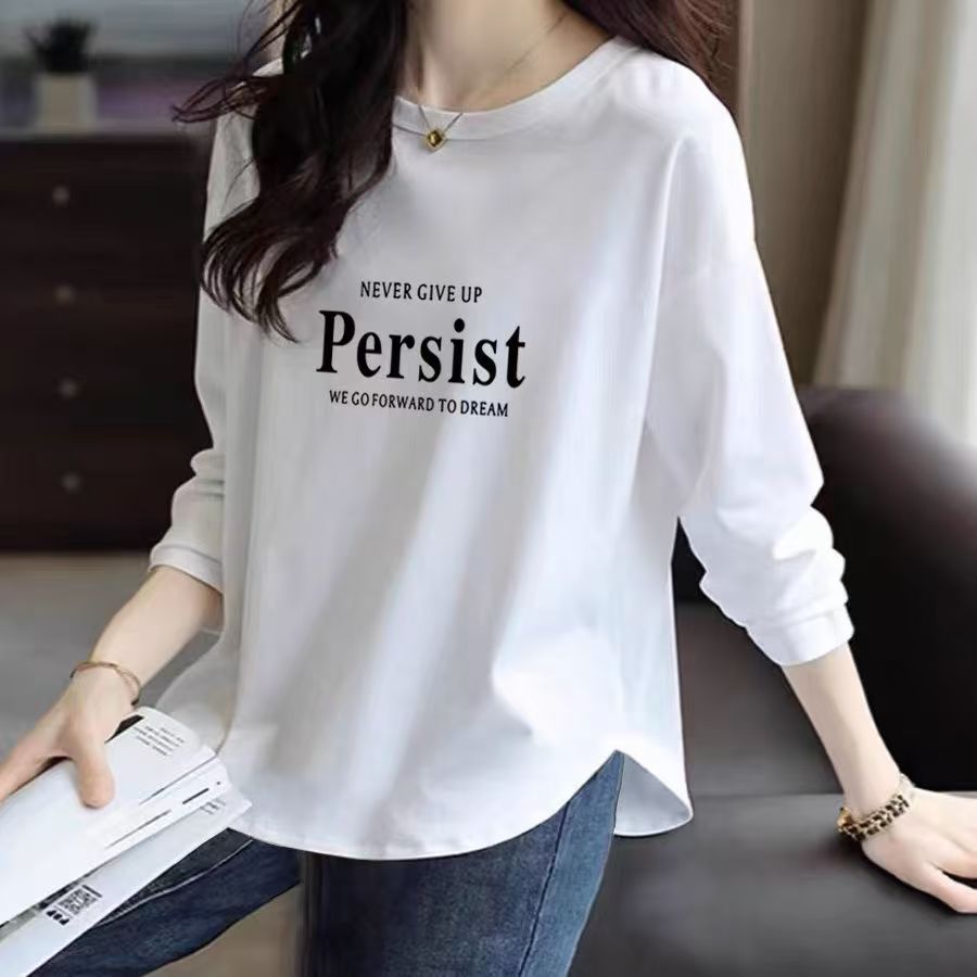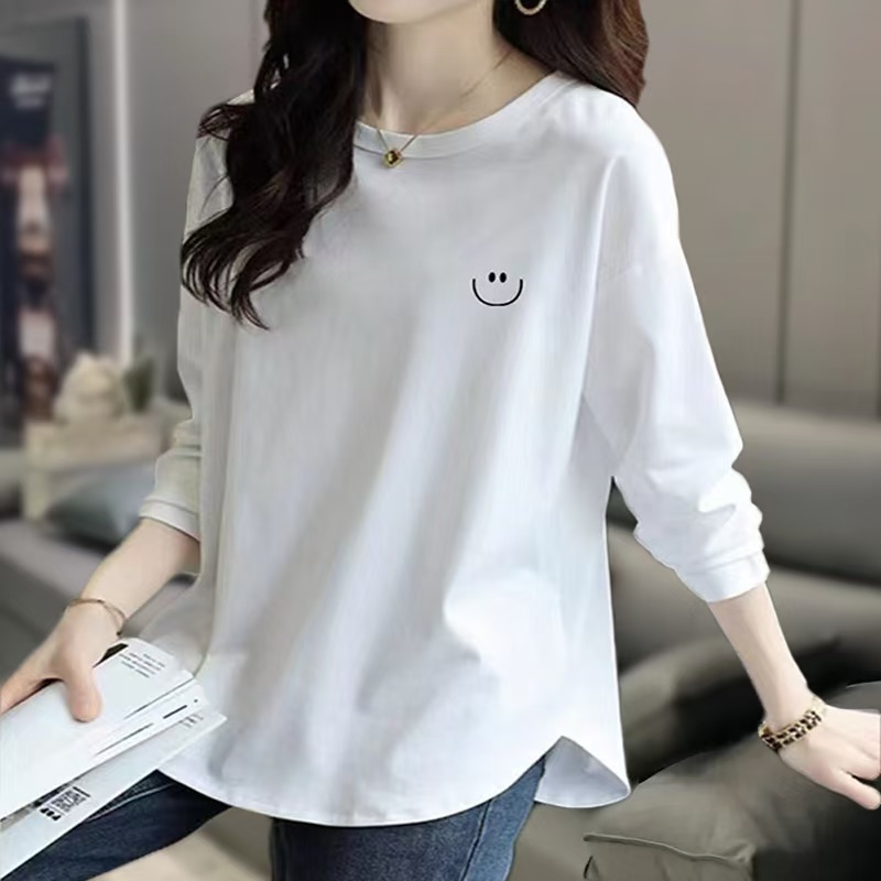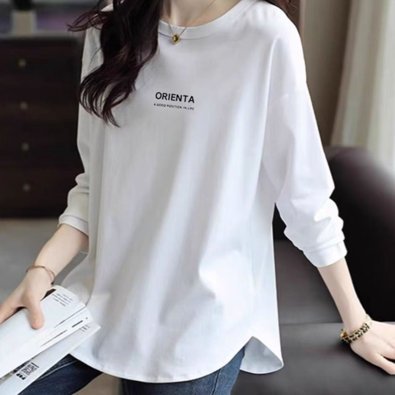 100%纯棉圆领长袖T恤女2025秋新款大码宽松弧形下摆遮肉显瘦上衣D