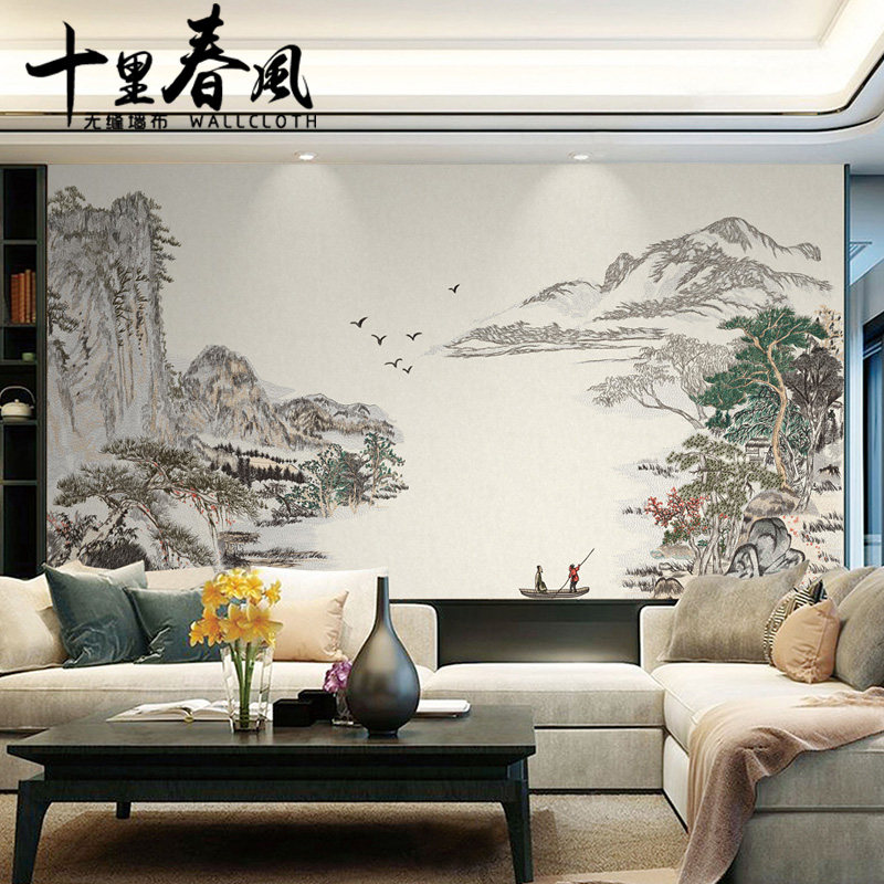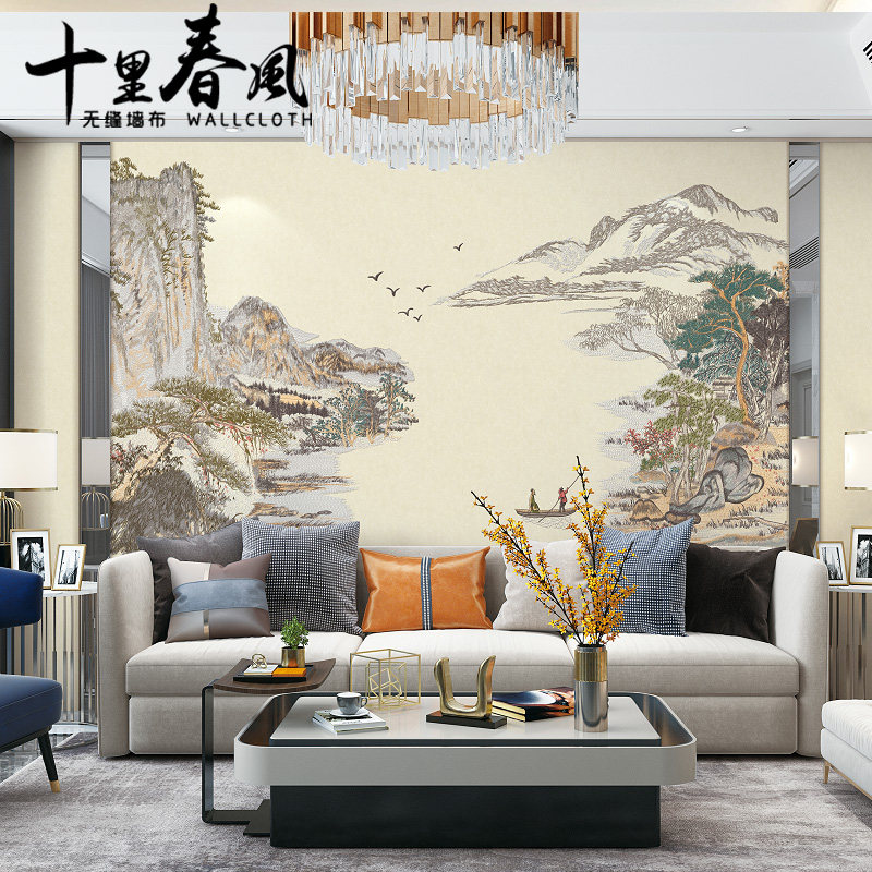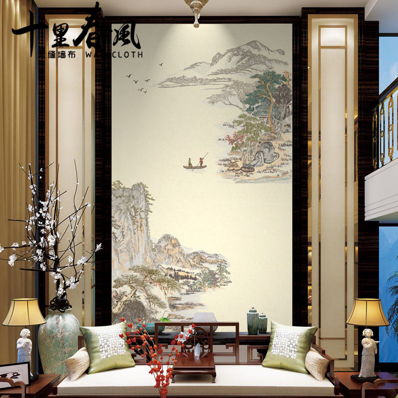独绣墙布端刺绣无缝壁布新客厅山水沙发背景墙定制玄关竖