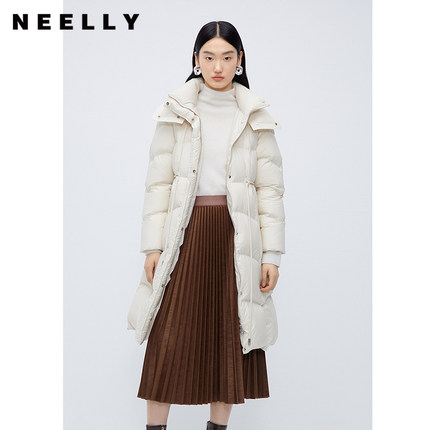 NEELLY纳俪商场同款显瘦羽绒服女冬中长款收腰保暖连帽白鸭绒大衣