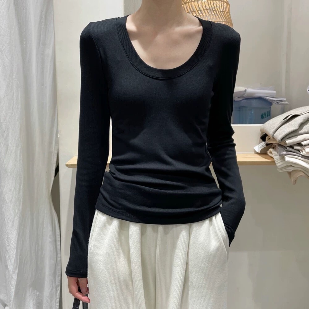 纯欲风低领洋气螺纹修身内搭2025春秋冬季u领长袖T恤女上衣打底衫