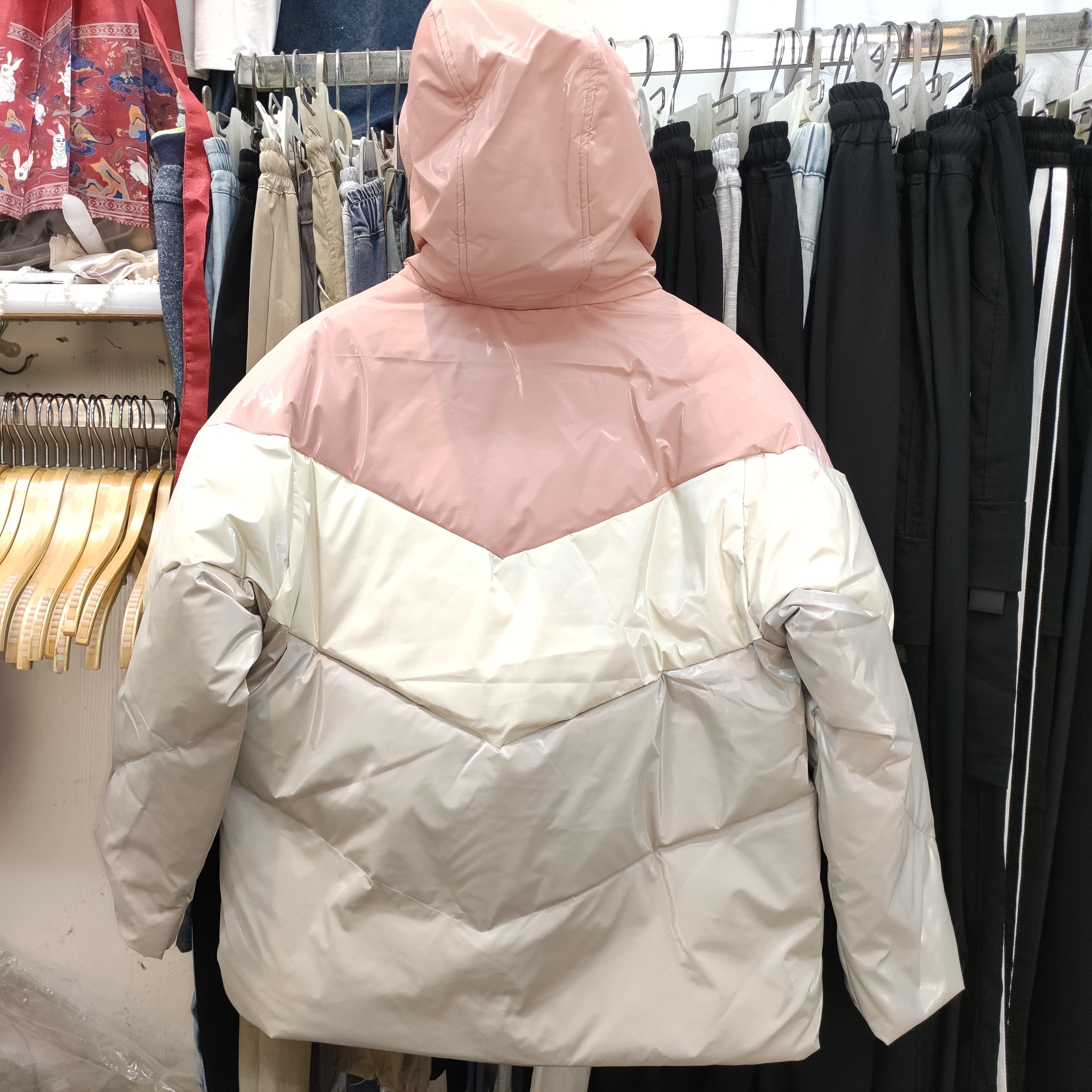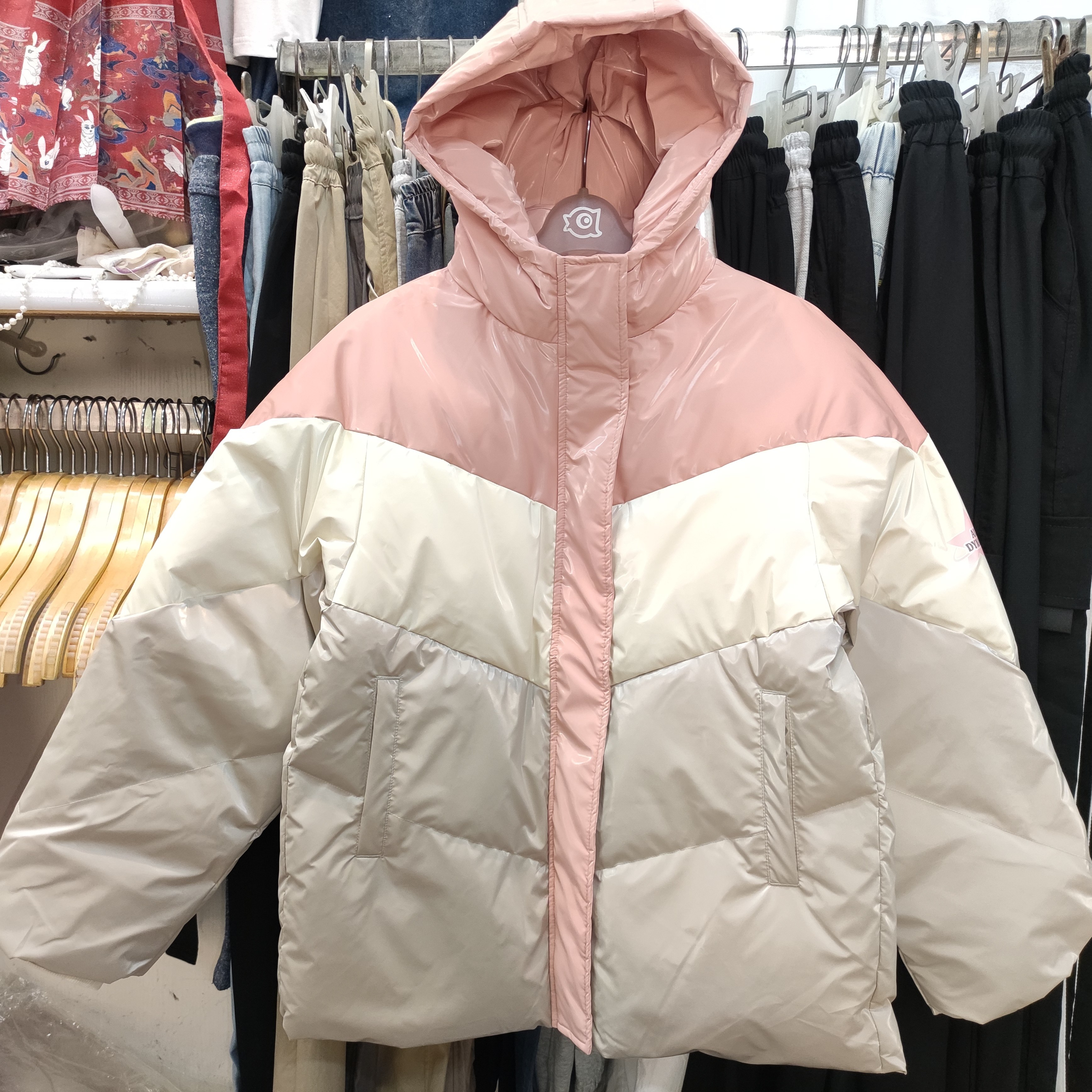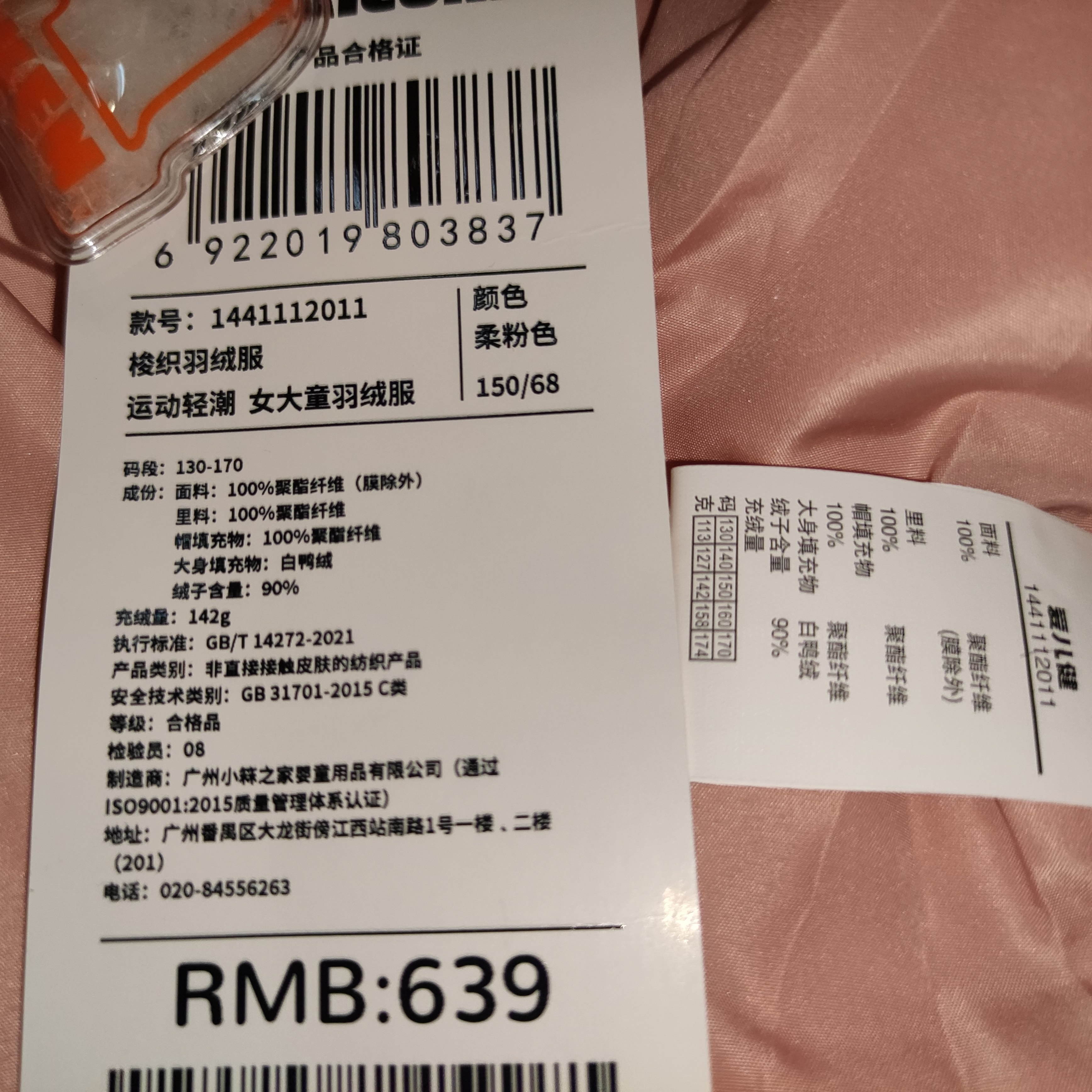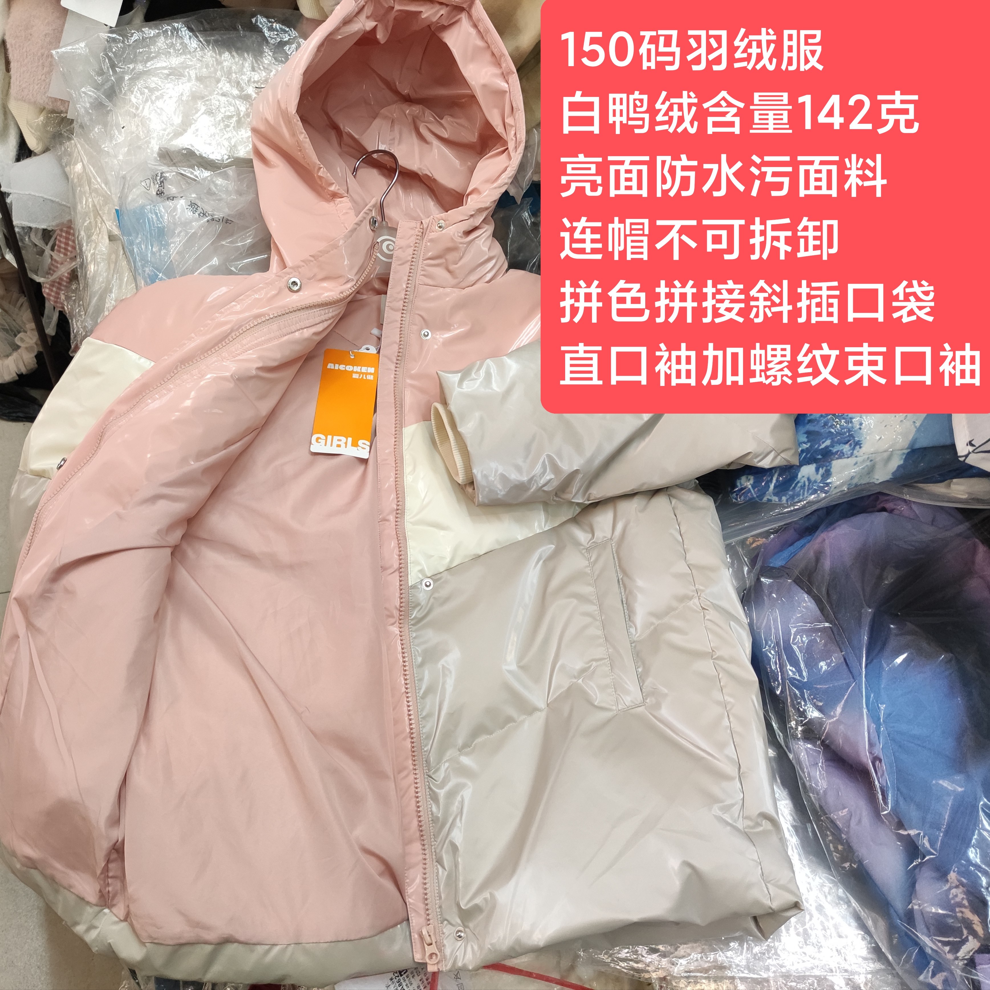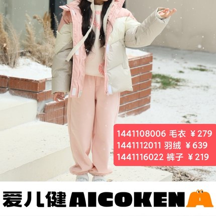 4.9折1爱儿健品牌童装1441112011女冬有帽开胸拉链羽绒服拼色拼接