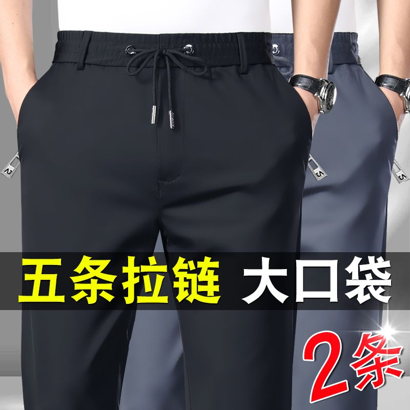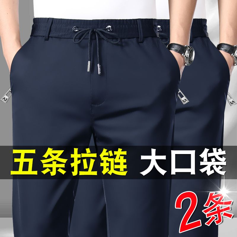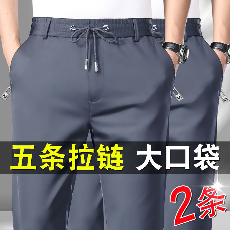 正品松紧腰冰丝卫裤男夏季薄款运动裤中老年西裤男多口袋拉链长裤