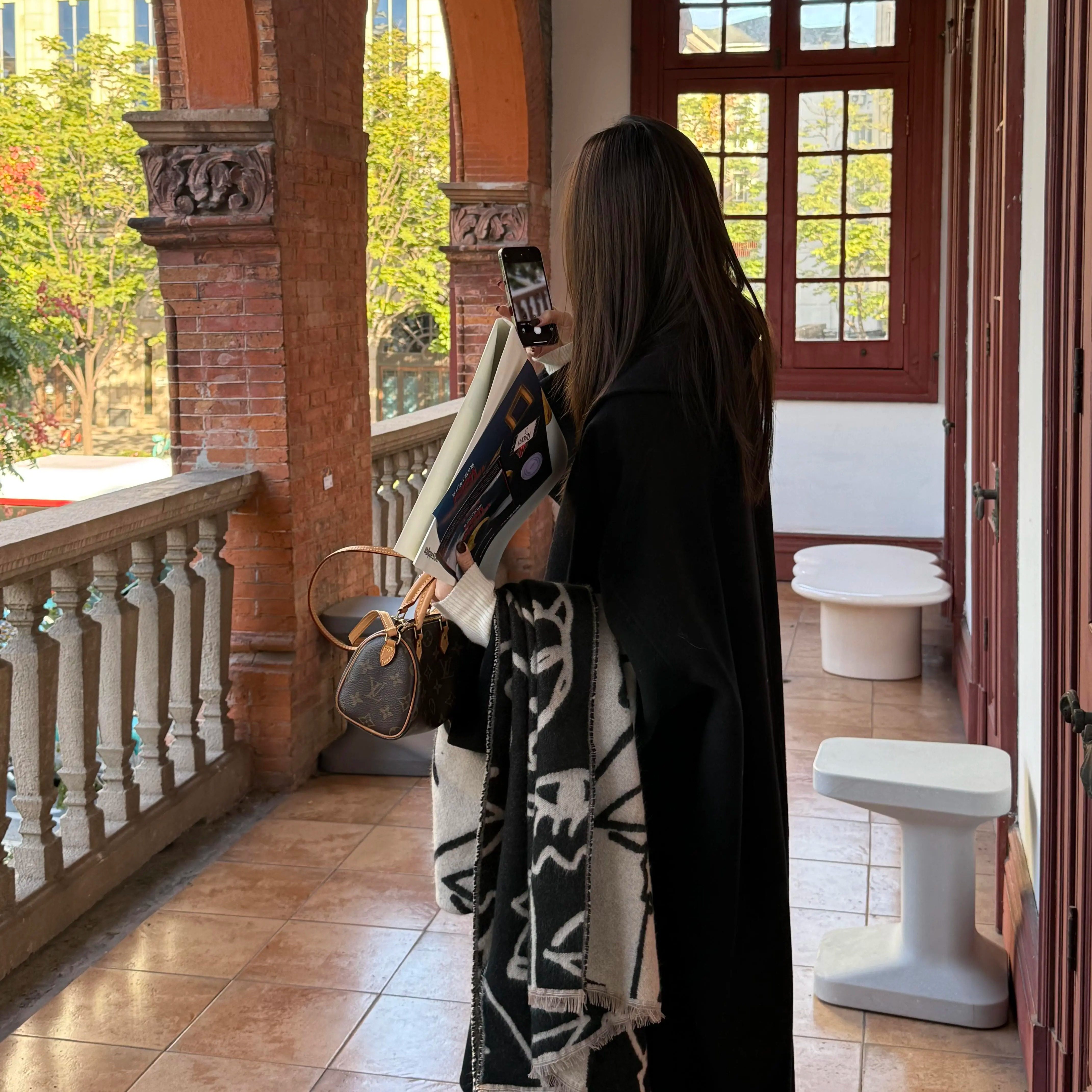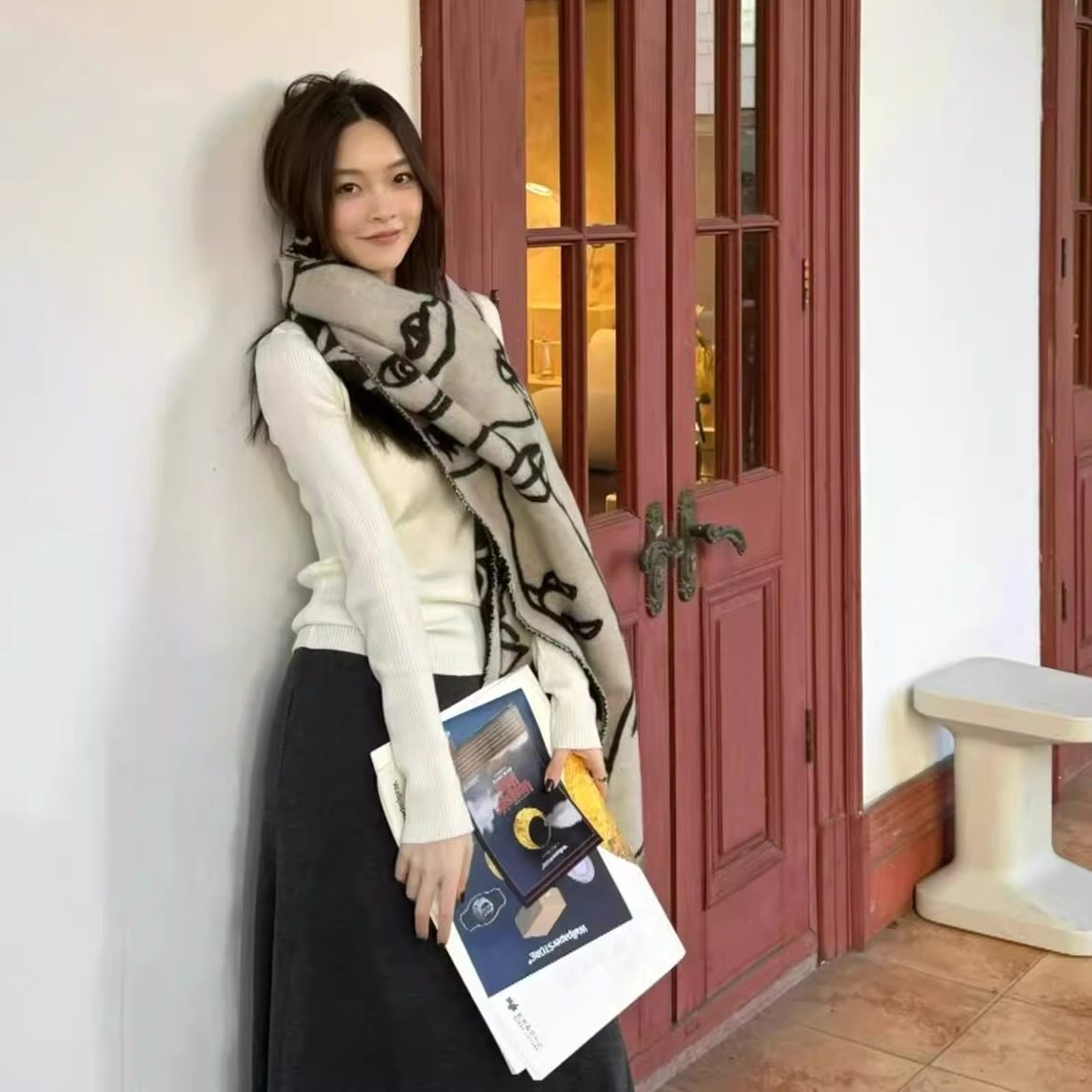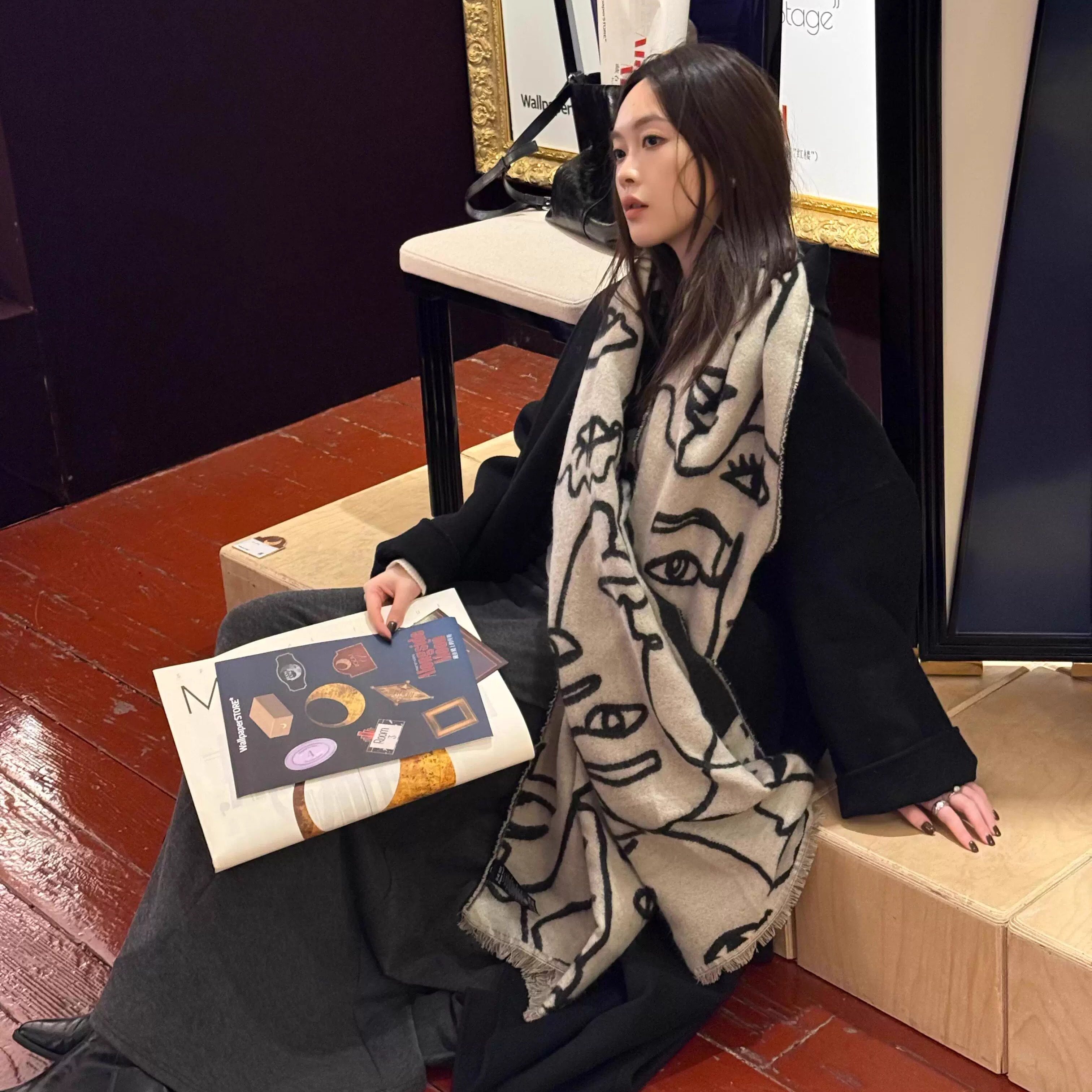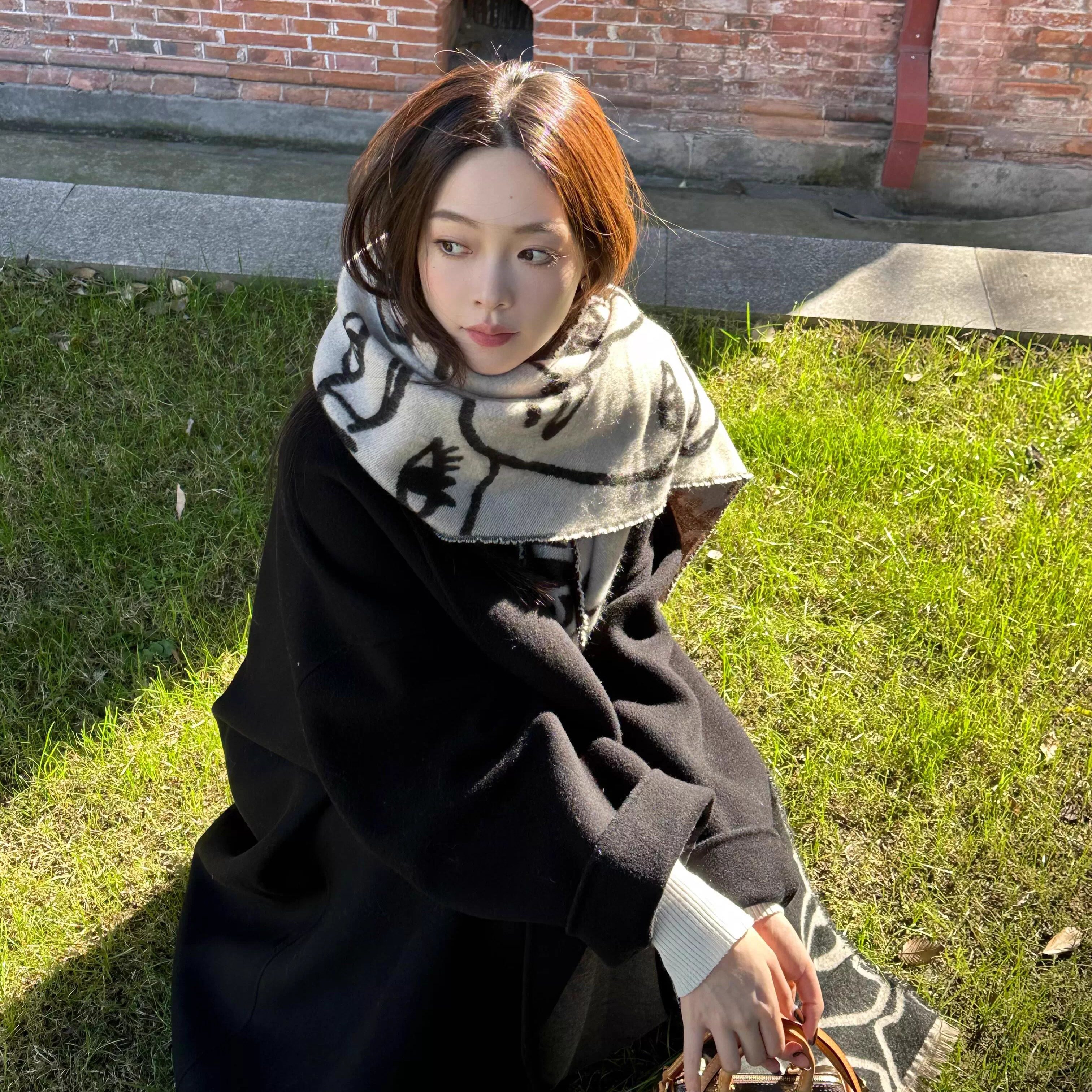 手绘双面线条围巾女2025新款冬季保暖围脖欧美风高级感仿羊绒披肩
