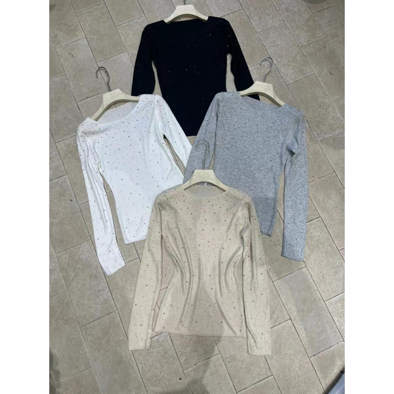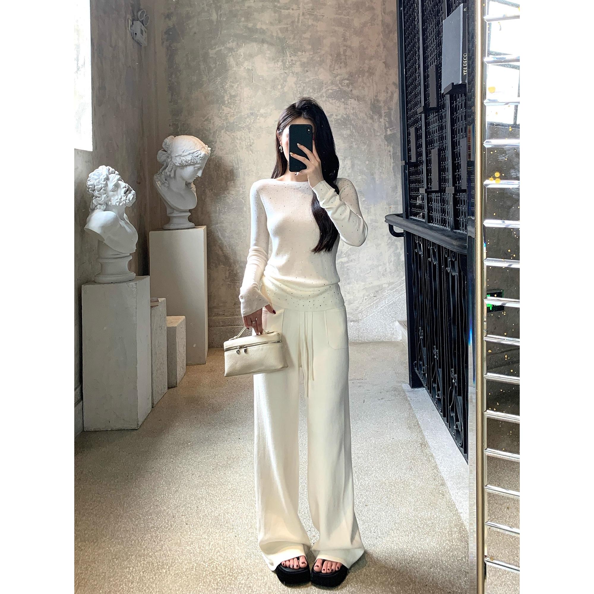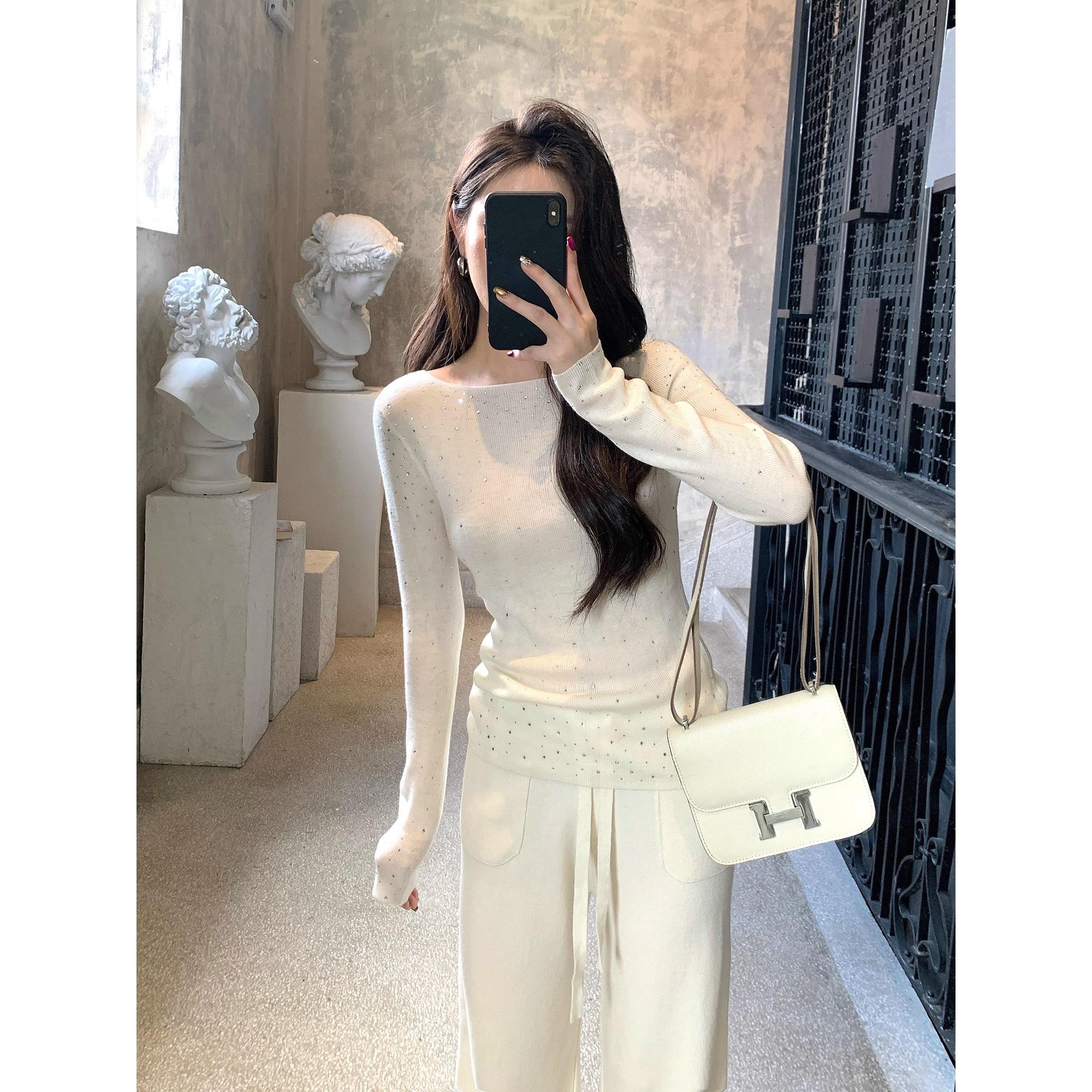 重工烫钻针织衫女秋季一字领毛衣慵懒风气质修身显瘦正肩长袖上衣