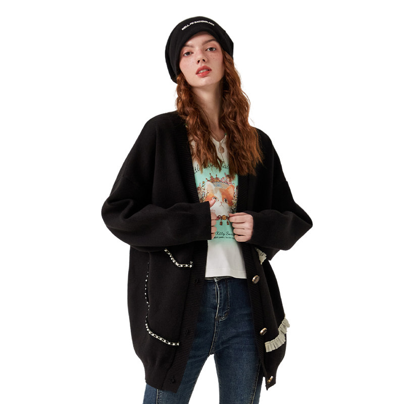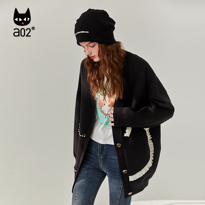 a02潮流针织外套开衫女2025秋季新品宽松V领猫咪毛衣时尚休闲上衣