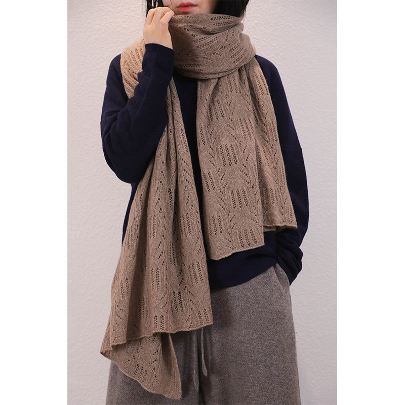 东雍 天然无染色镂空钩花秋冬保暖纯色羊绒针织毛线围巾披肩两用