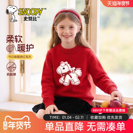 史努比儿童红色毛衣喜庆拜年服2026新款冬打底针织衫女童加绒上衣