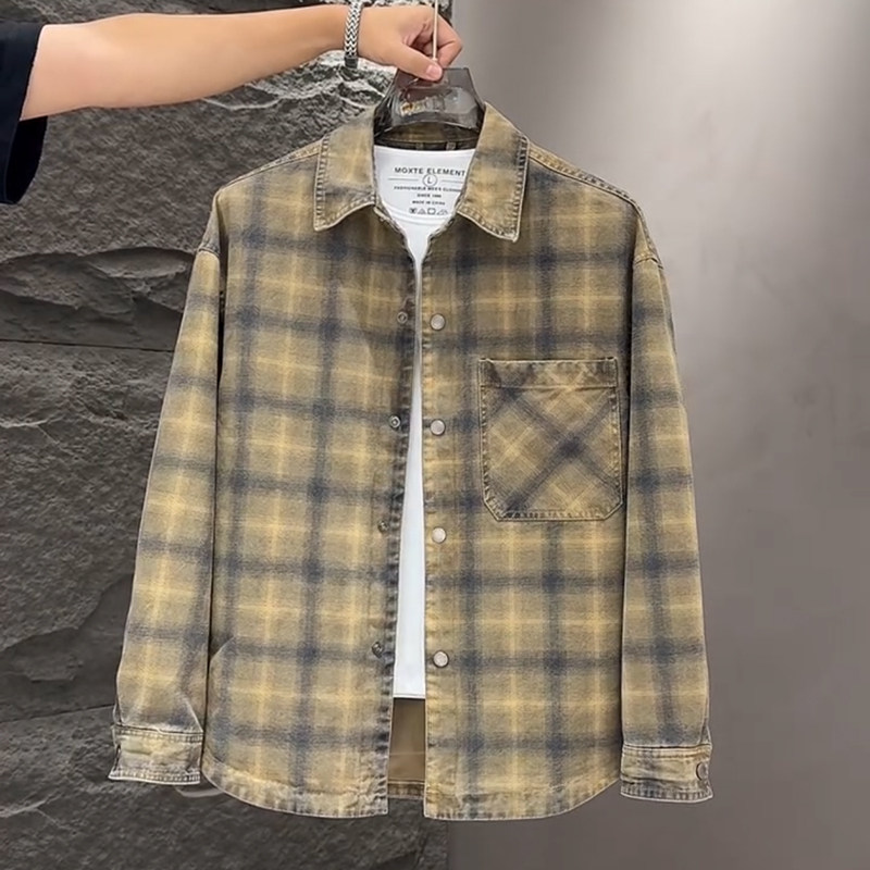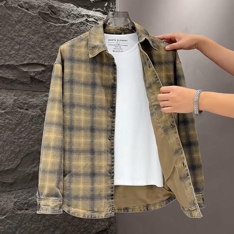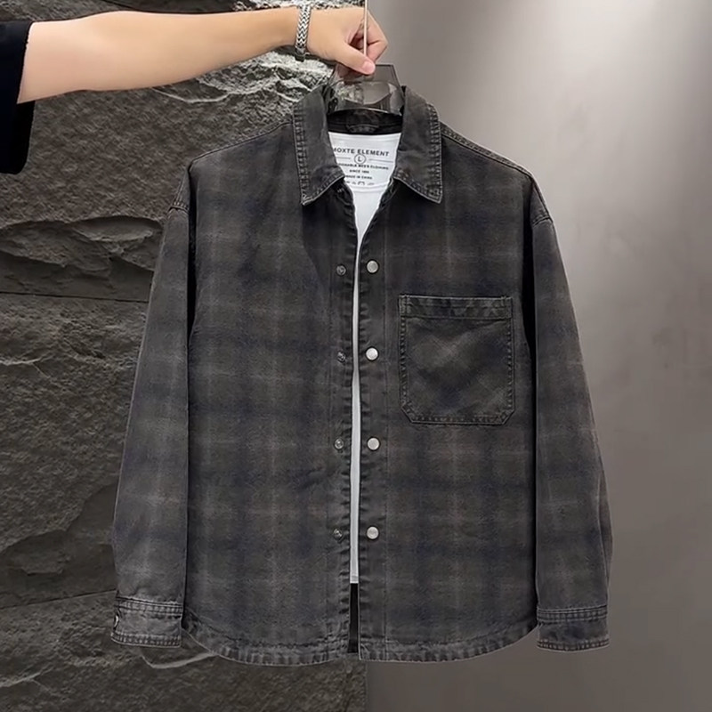 春秋款格子牛仔外套男款潮牌