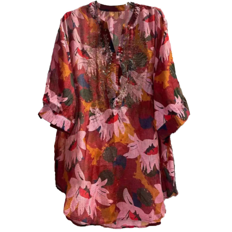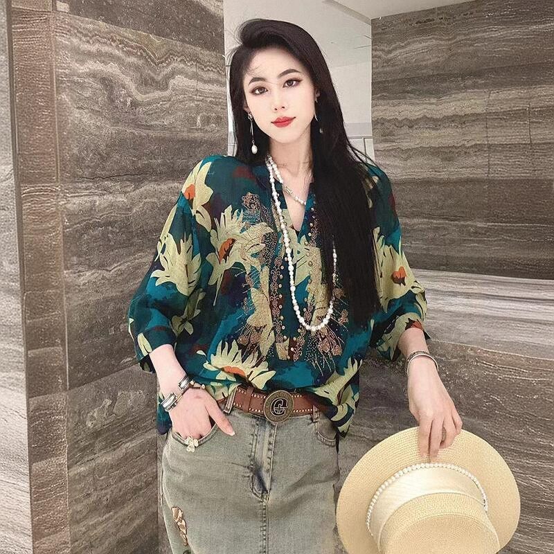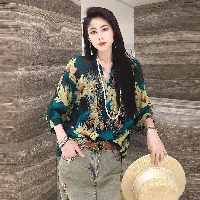 烫钻2026夏季新款时尚气质印花衬衫女士宽松显瘦百搭洋气减龄上衣